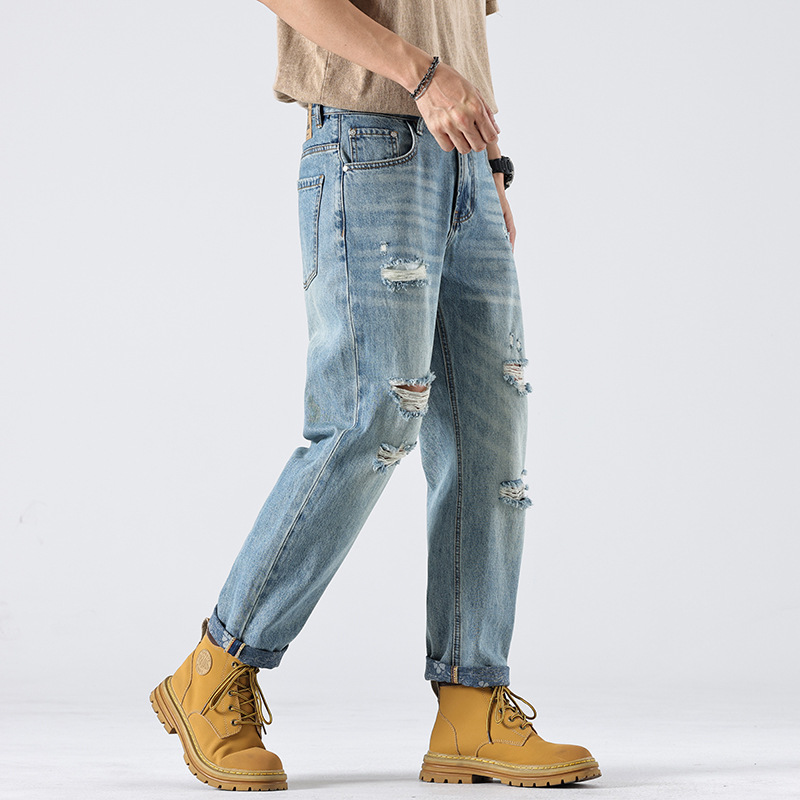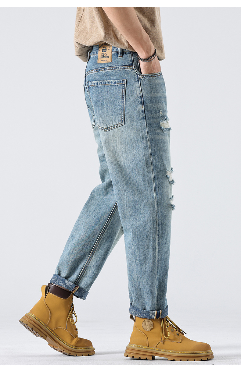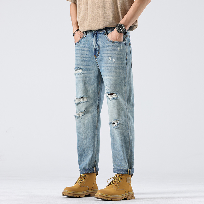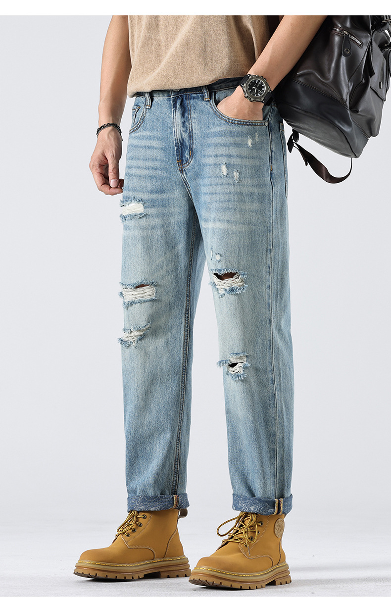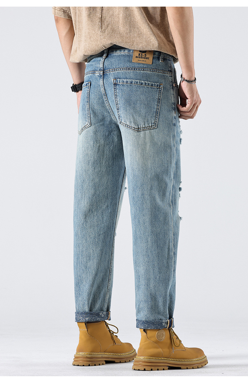 春季新款水洗破洞牛仔裤男美式复古宽松直筒休闲潮牌锥形长裤