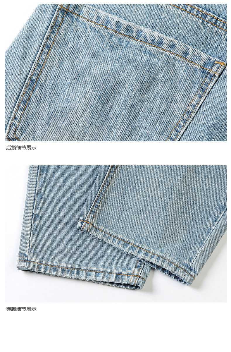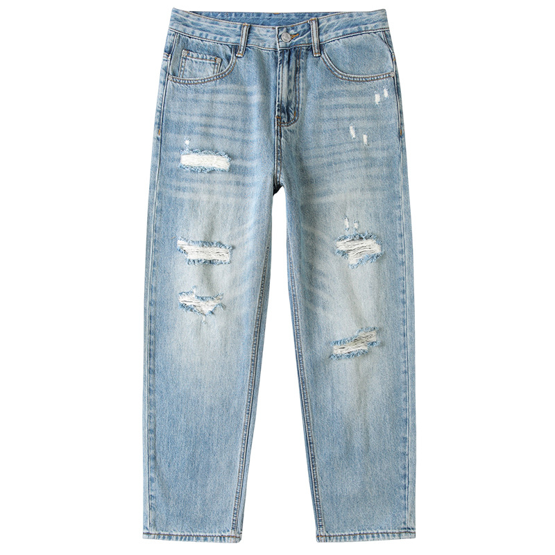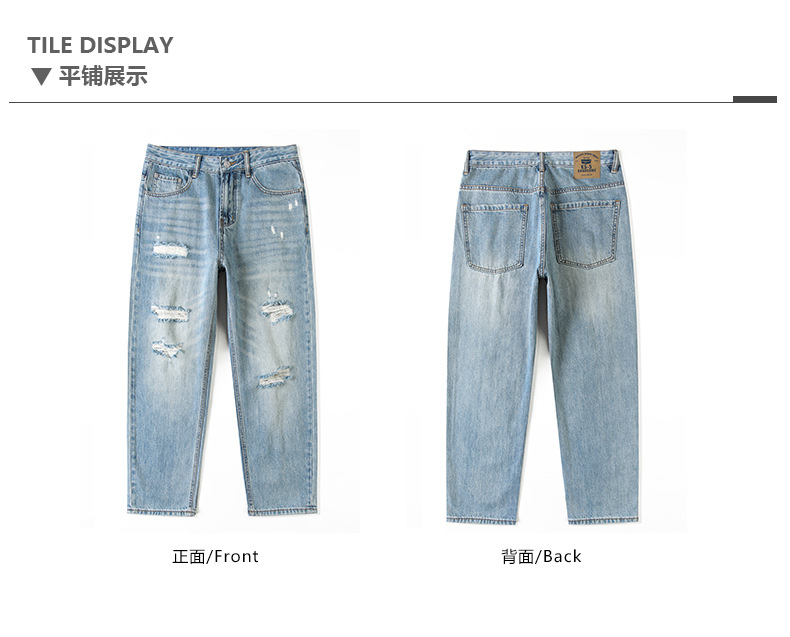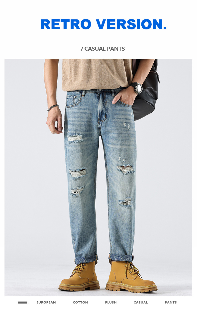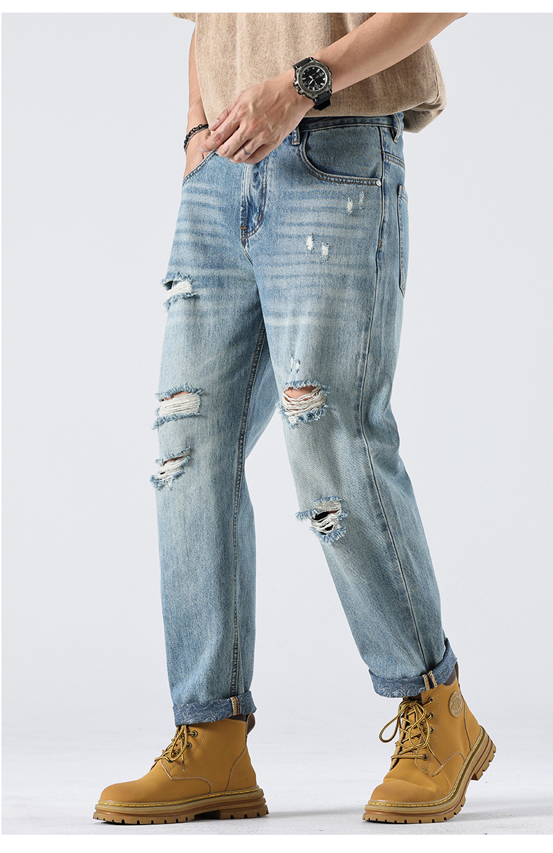 春季新款水洗破洞牛仔裤男美式复古宽松直筒休闲潮牌锥形长裤