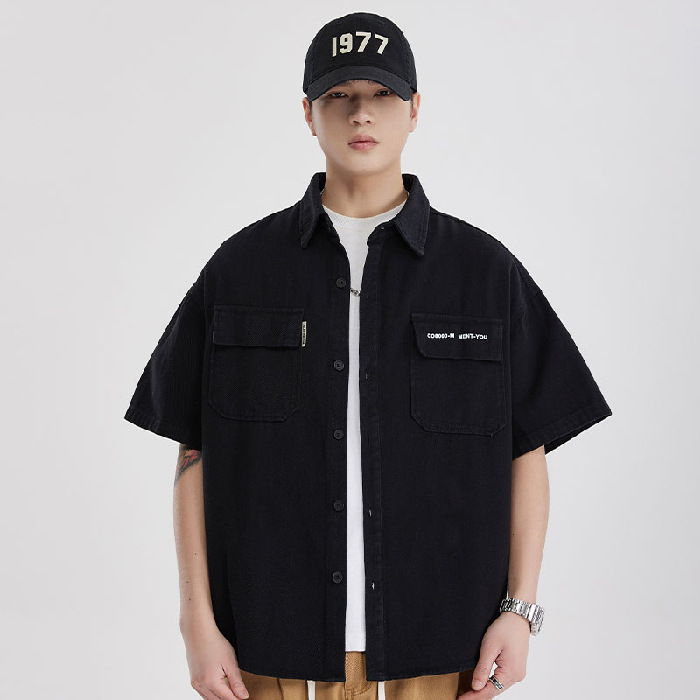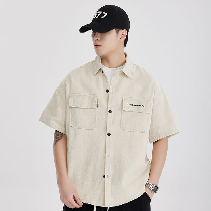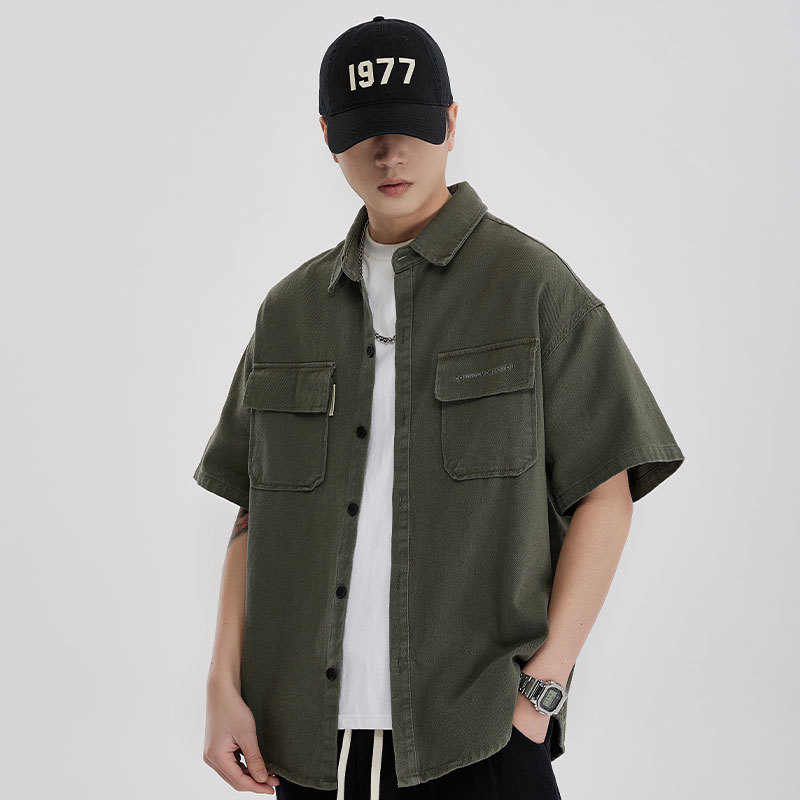 纯棉美式潮牌户外工装衬衫短袖外套男宽松男士大码五分袖夏季衬衣