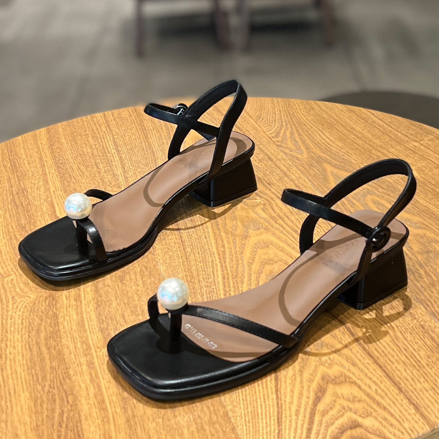 气质仙女风粗跟细带夹趾凉鞋女夏新款棕色一字扣带套趾时装鞋