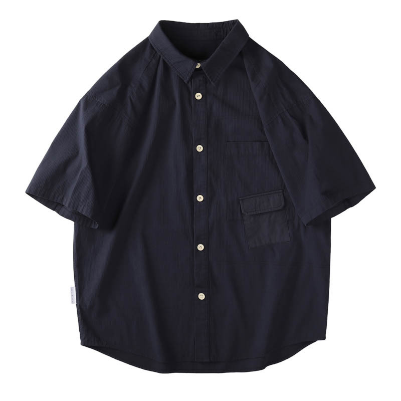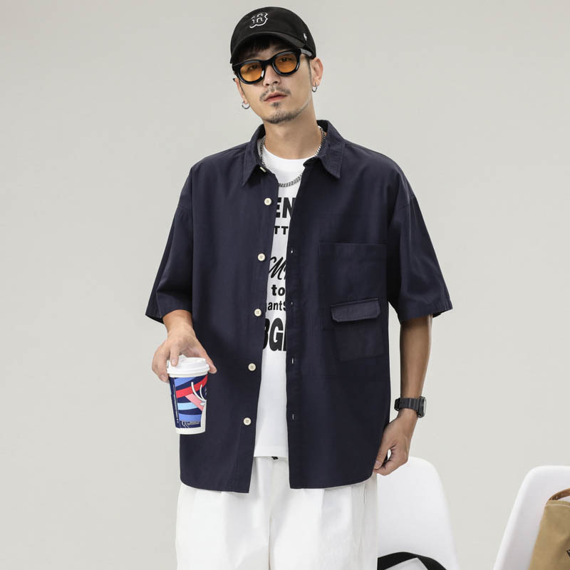 日系复古工装短袖衬衫男士宽松拼接口袋衬衣夏季潮牌休闲半袖外套