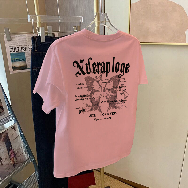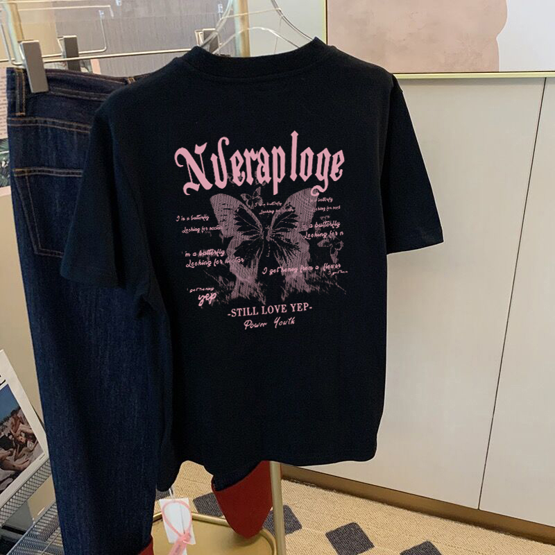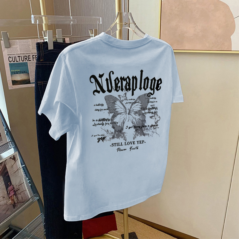 白色纯棉短袖t恤女夏季2025新款蝴蝶印花宽松大码设计感小众上衣