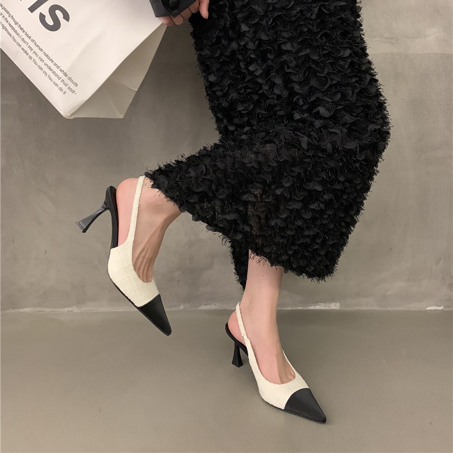 小香风法式细跟高跟鞋尖头包头后空绊带凉鞋女夏季新款配裙子浅