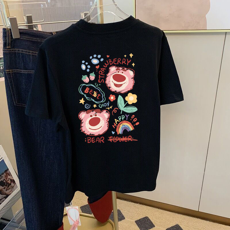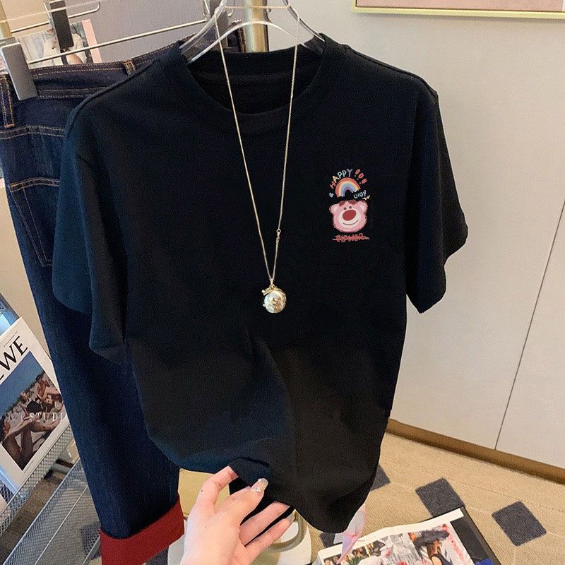 2025夏季新款设计感小熊图案宽松纯棉短袖t恤女正肩百搭半袖上衣
