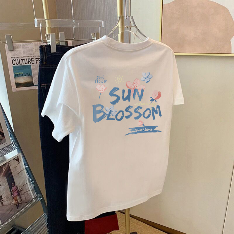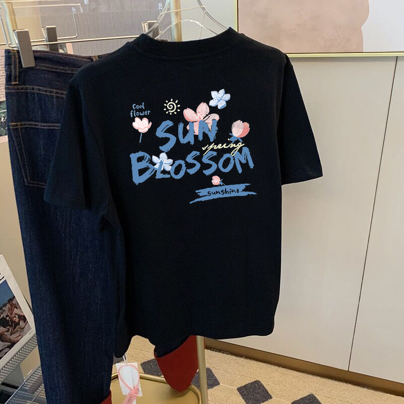 2025夏季新款蓝色纯棉短袖t恤女宽松百搭正肩小个子洋气减龄上衣