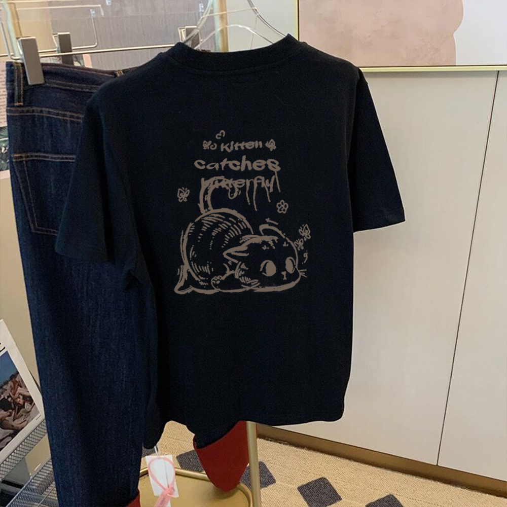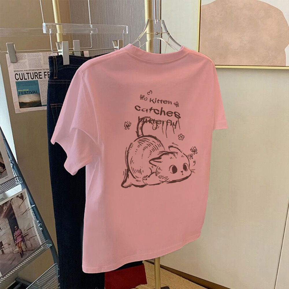 2025夏季新款白色全棉短袖t恤女宽松百搭休闲小个子卡通印花上衣