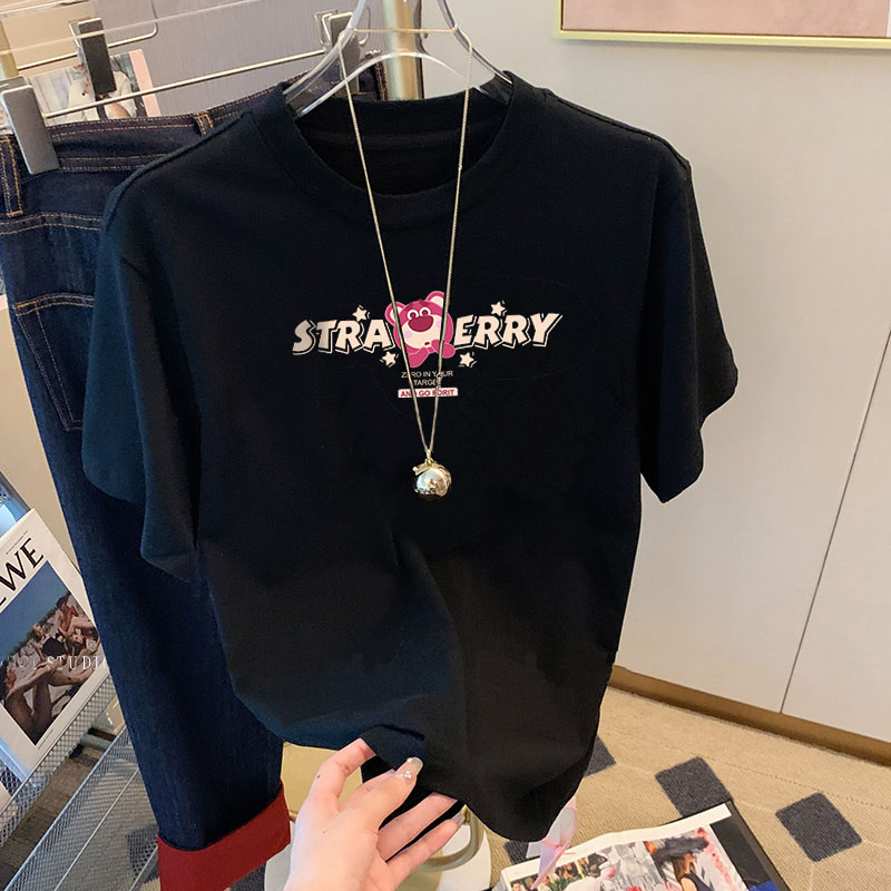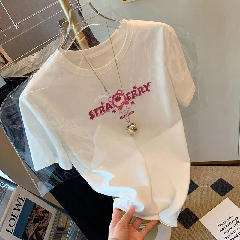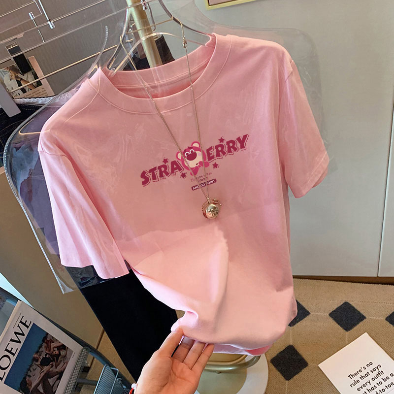 2025夏季新款小熊正肩粉色纯棉短袖T恤女时尚宽松百搭白色上衣潮