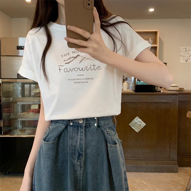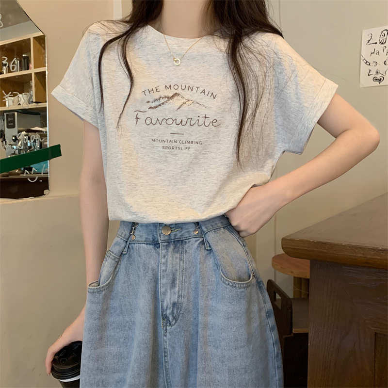 2025夏季新款花灰色纯棉短袖t恤女宽松百搭时尚减龄字母印花上衣