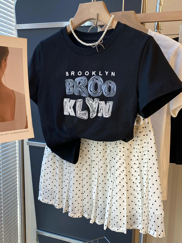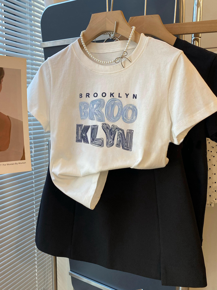 2025夏季新款字母印花藏蓝色短袖t恤女全棉宽松百搭洋气减龄上衣