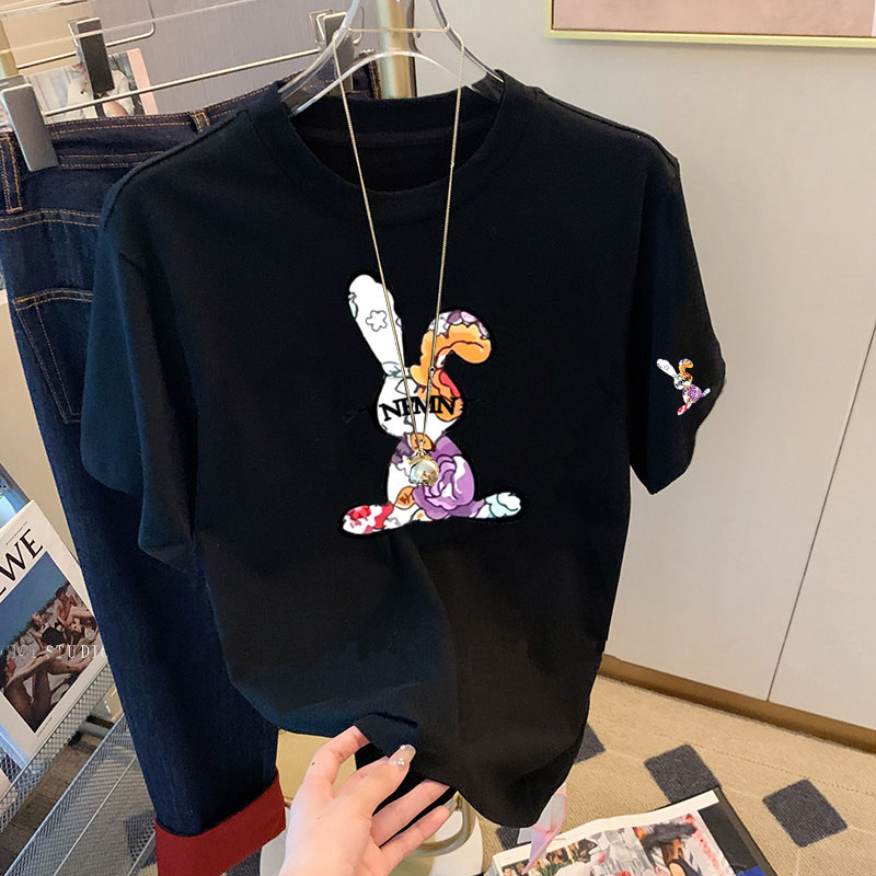 夏季新款卡通兔子正肩纯棉短袖T恤女宽松百搭减龄白色上衣潮