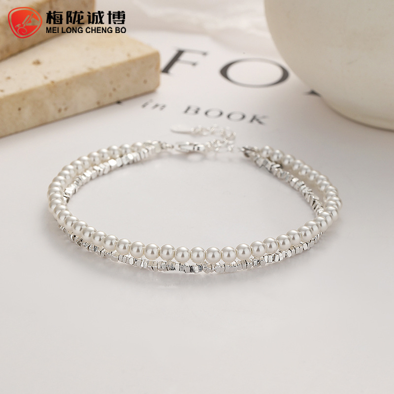 925纯银碎银子珍珠手链女复古珍珠双层手链个性设计感气质银饰品