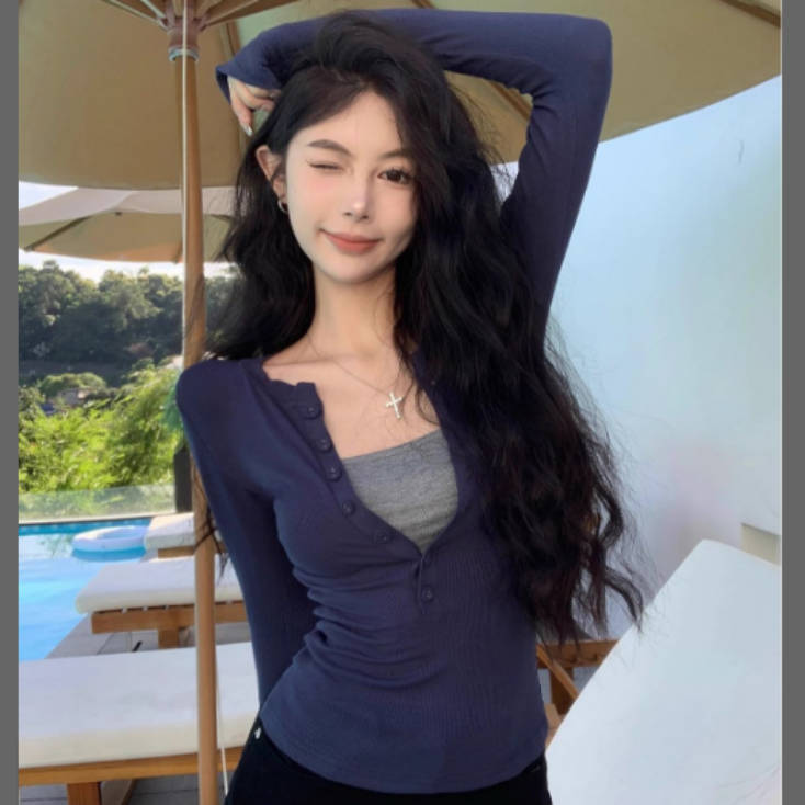 美式性感V领紧身辣妹上衣女短款修身露脐纯欲风纽扣长袖打底衫