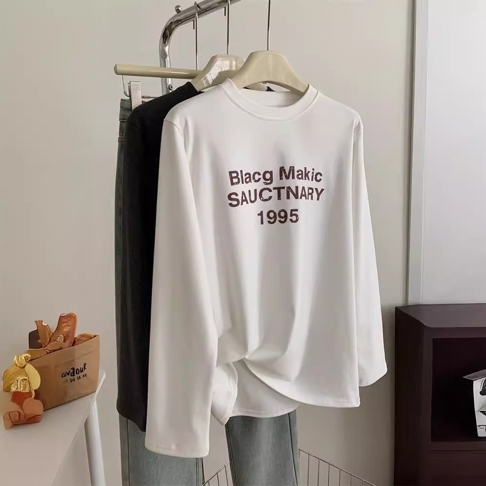 基础百搭双面磨毛长袖T恤女宽松韩版春季内搭白色圆领字母打底衫