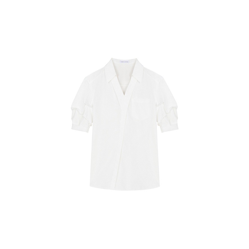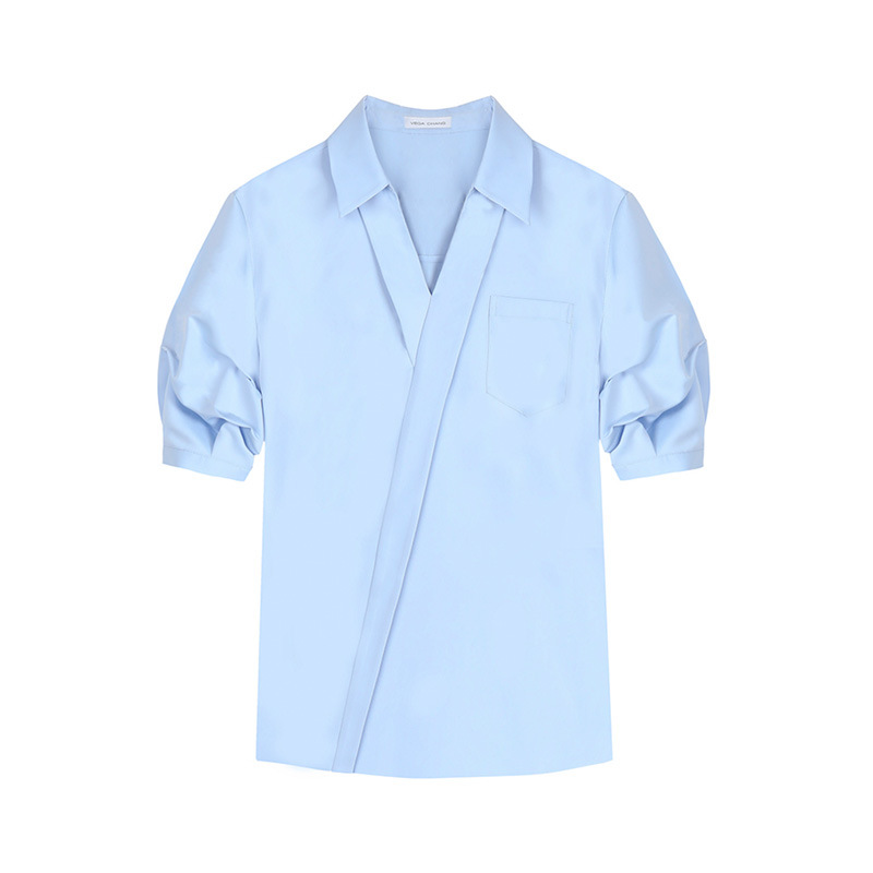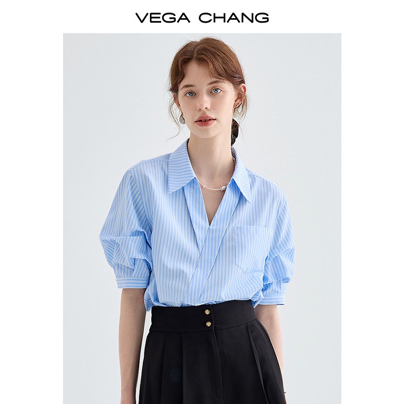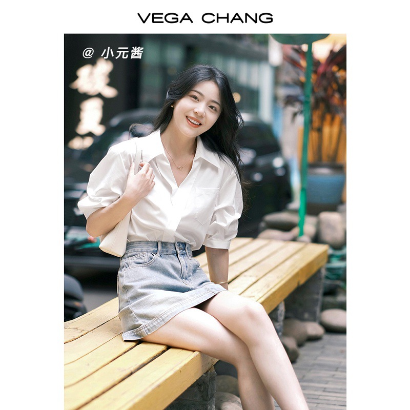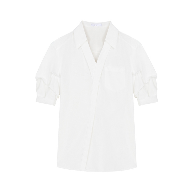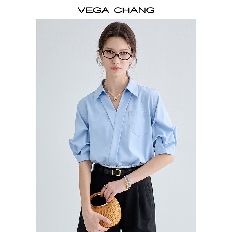 VEGA CHANG衬衫女夏季新款休闲宽松法式V领短袖凉感白衬衣