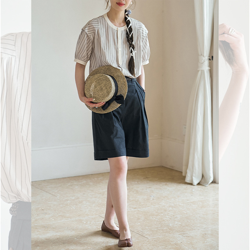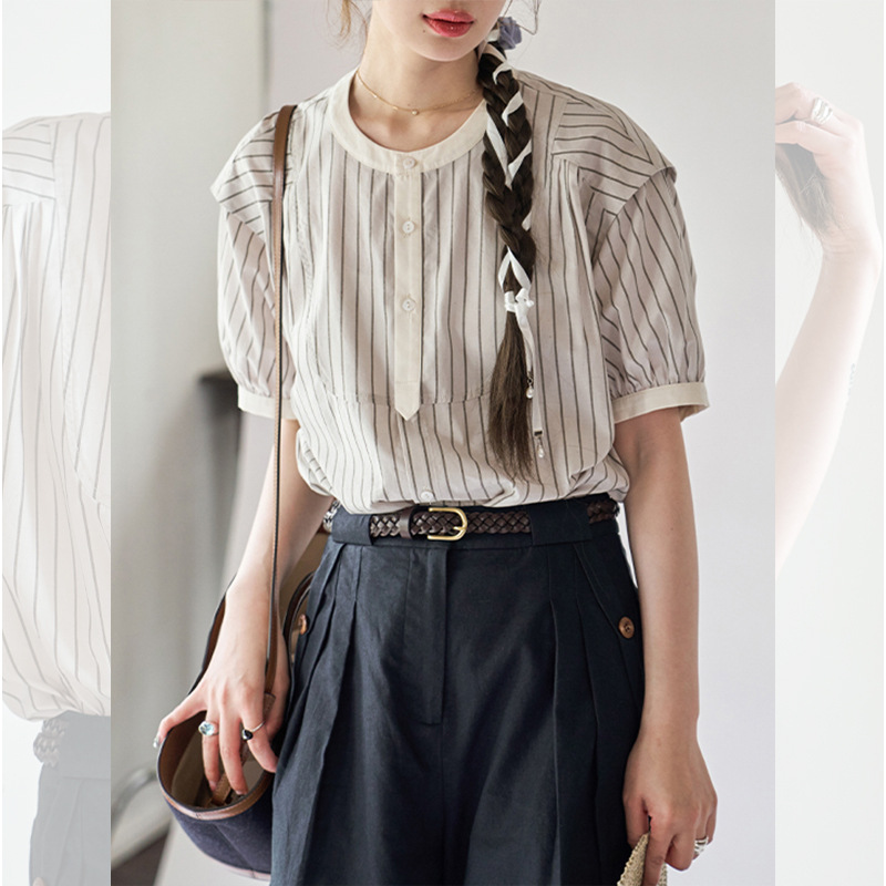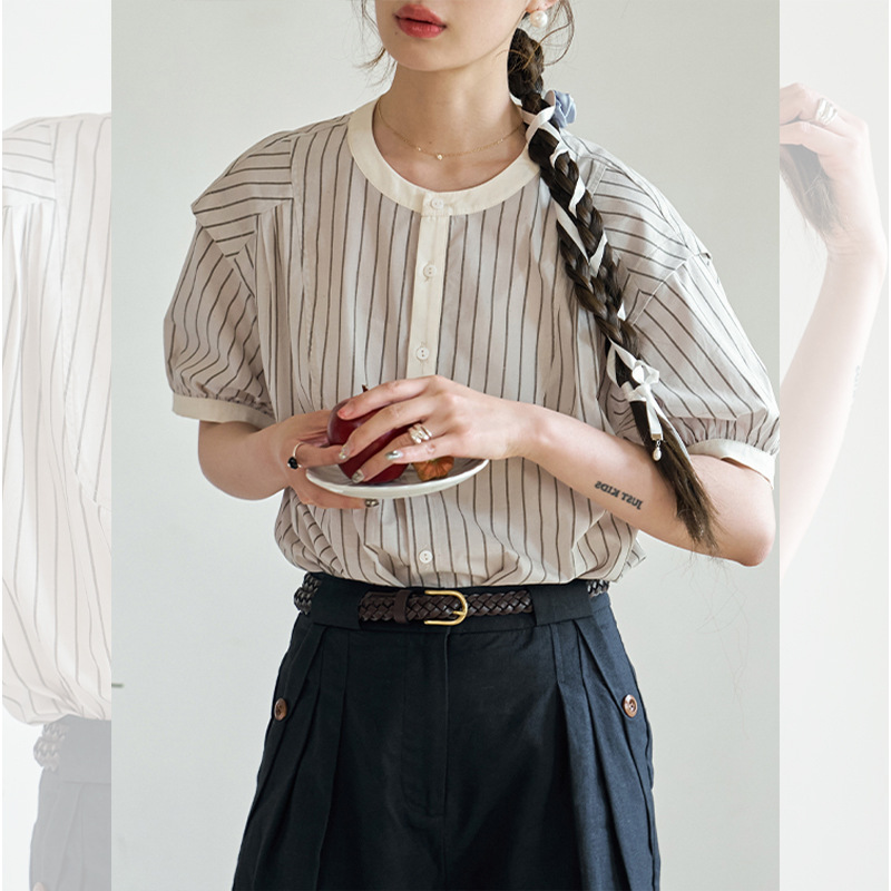 白描工作间黑白条纹短袖衬衫女夏季法式复古文艺圆领衬衣上衣