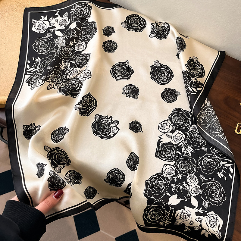春季热款简约设计感真丝丝巾女百搭气质玫瑰桑蚕丝丝巾时尚小方巾