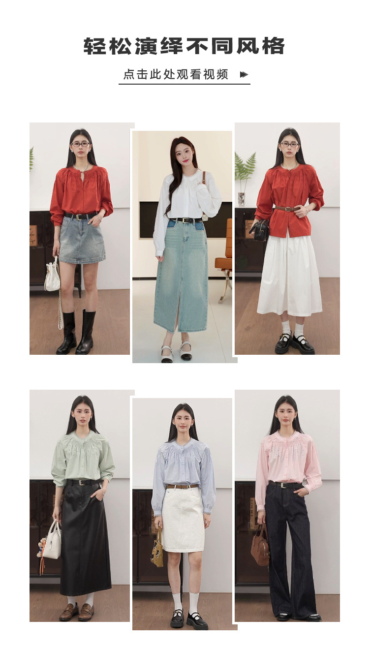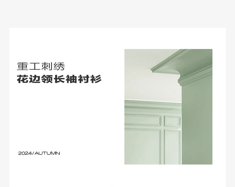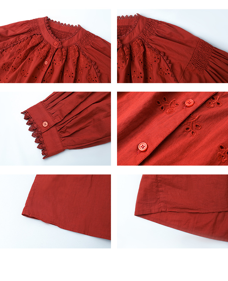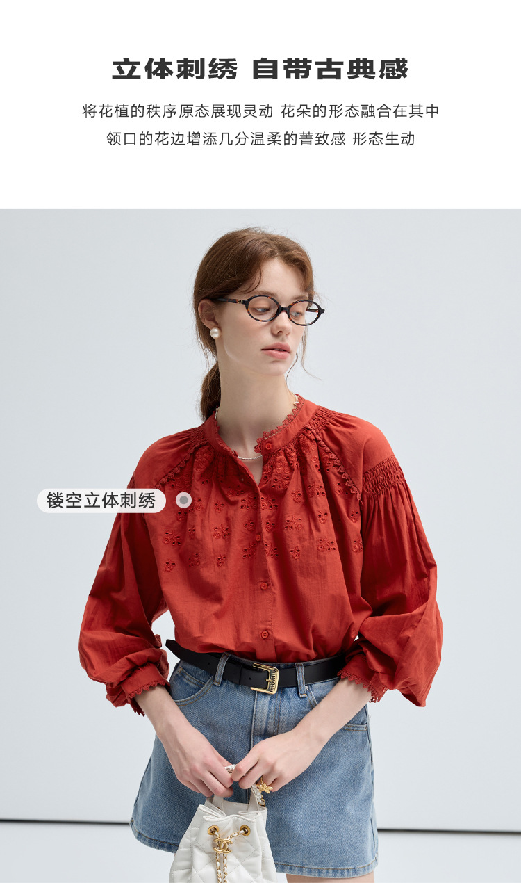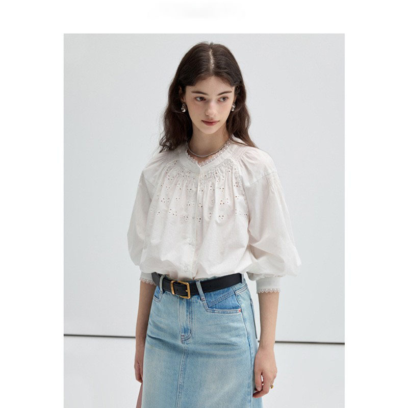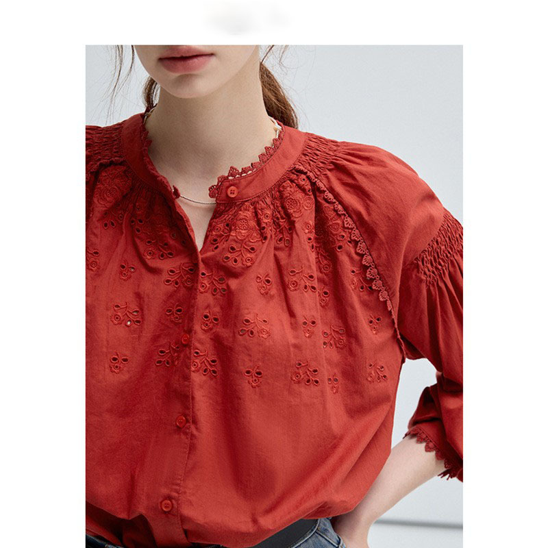 VEGA CHANG法式衬衫女2025年春季新款复古花边领缕空刺绣长袖上衣