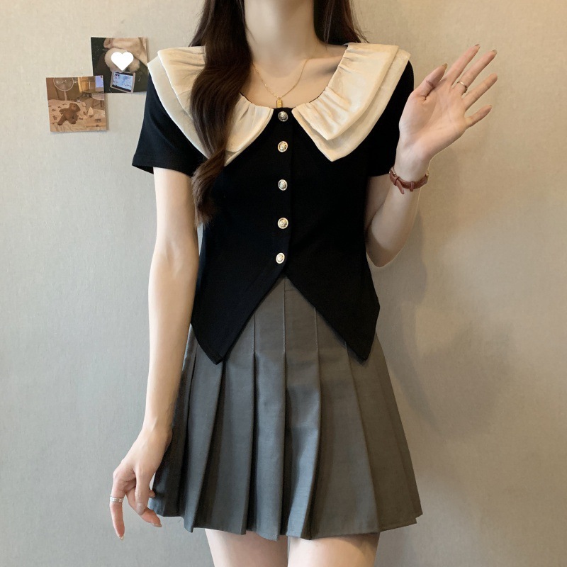实拍夏款新款胖MM撞色双领设计感时尚百搭上衣纯欲风修身T恤