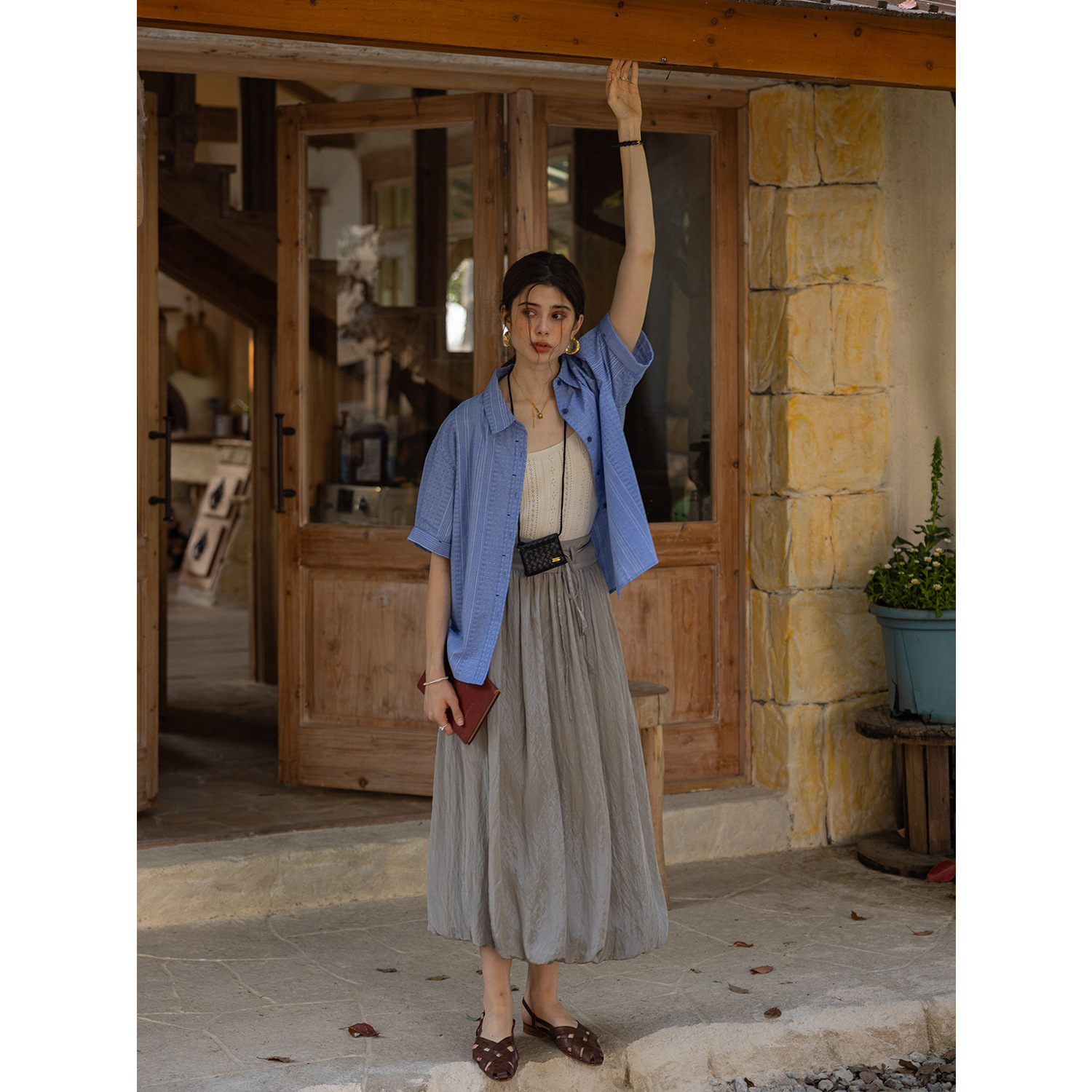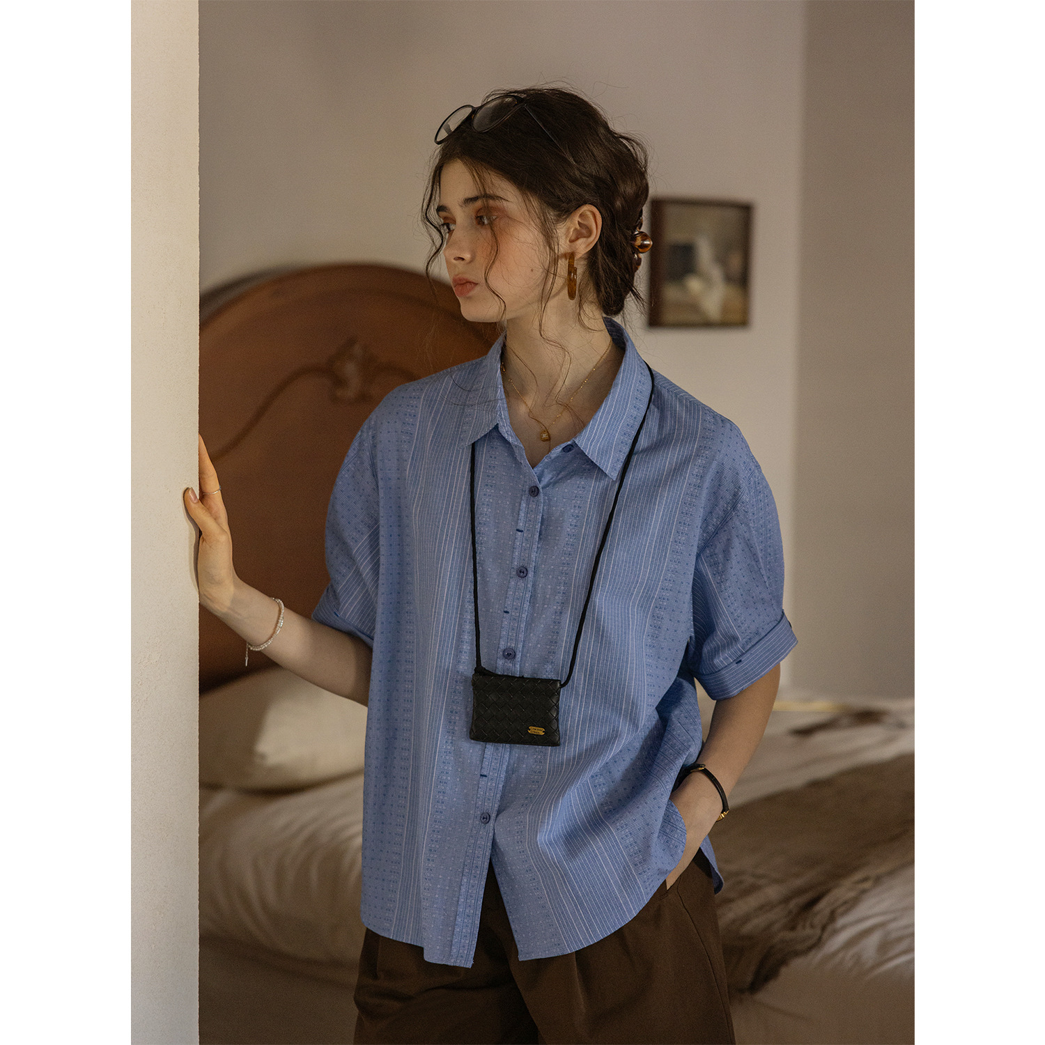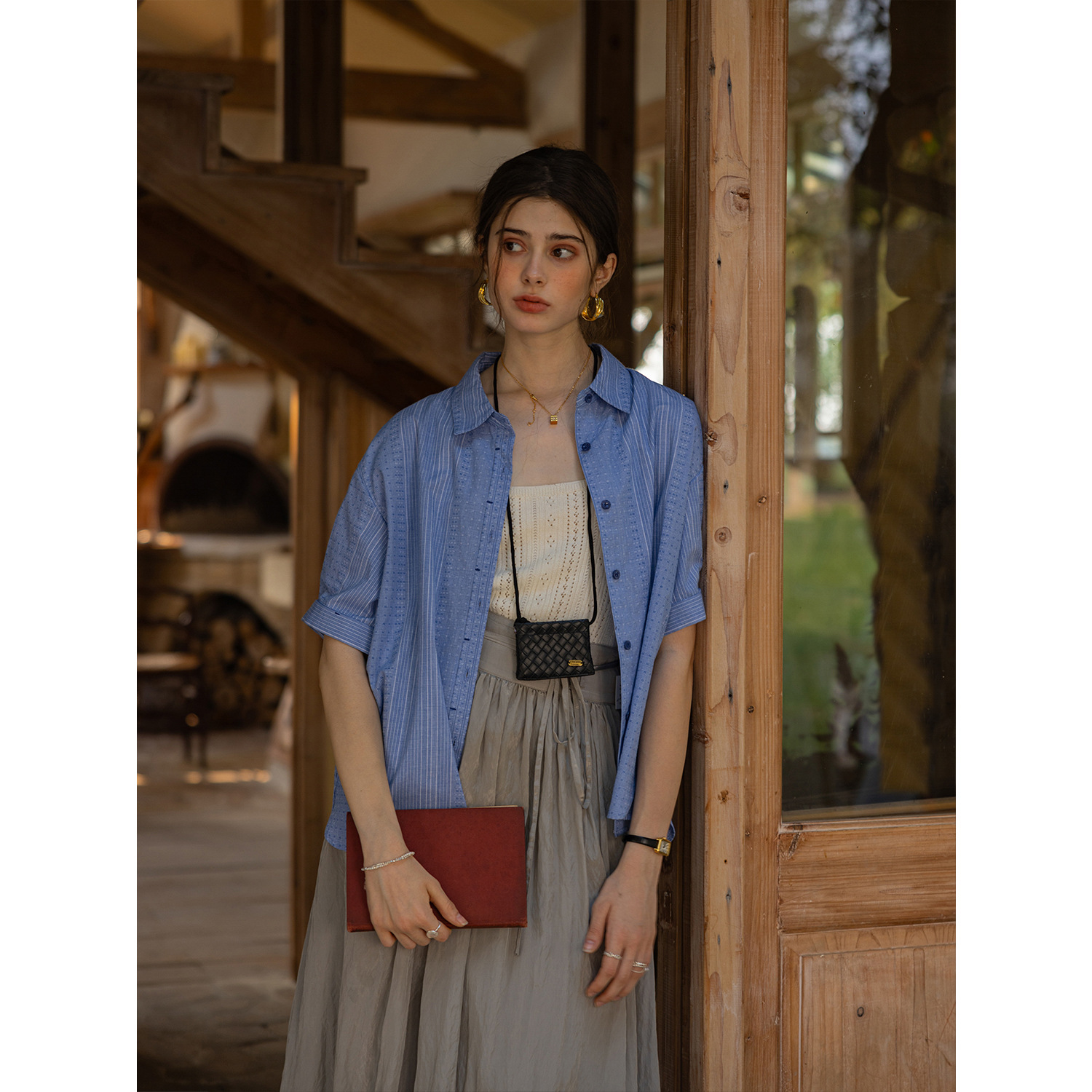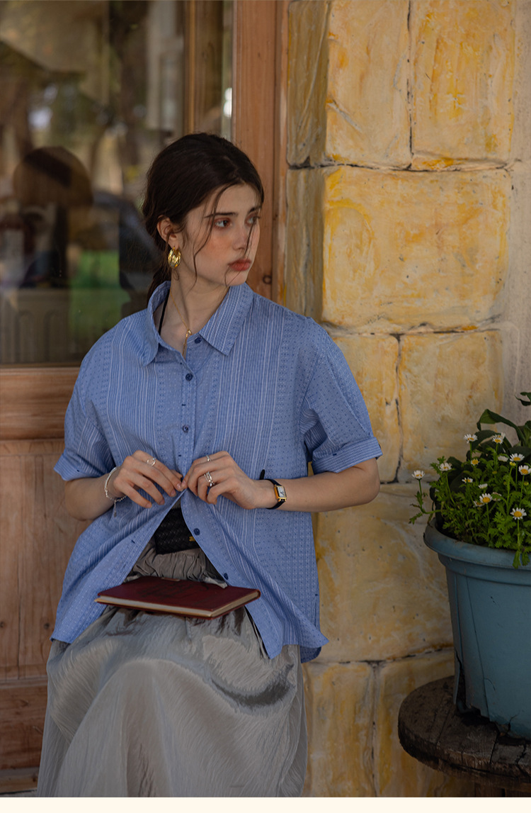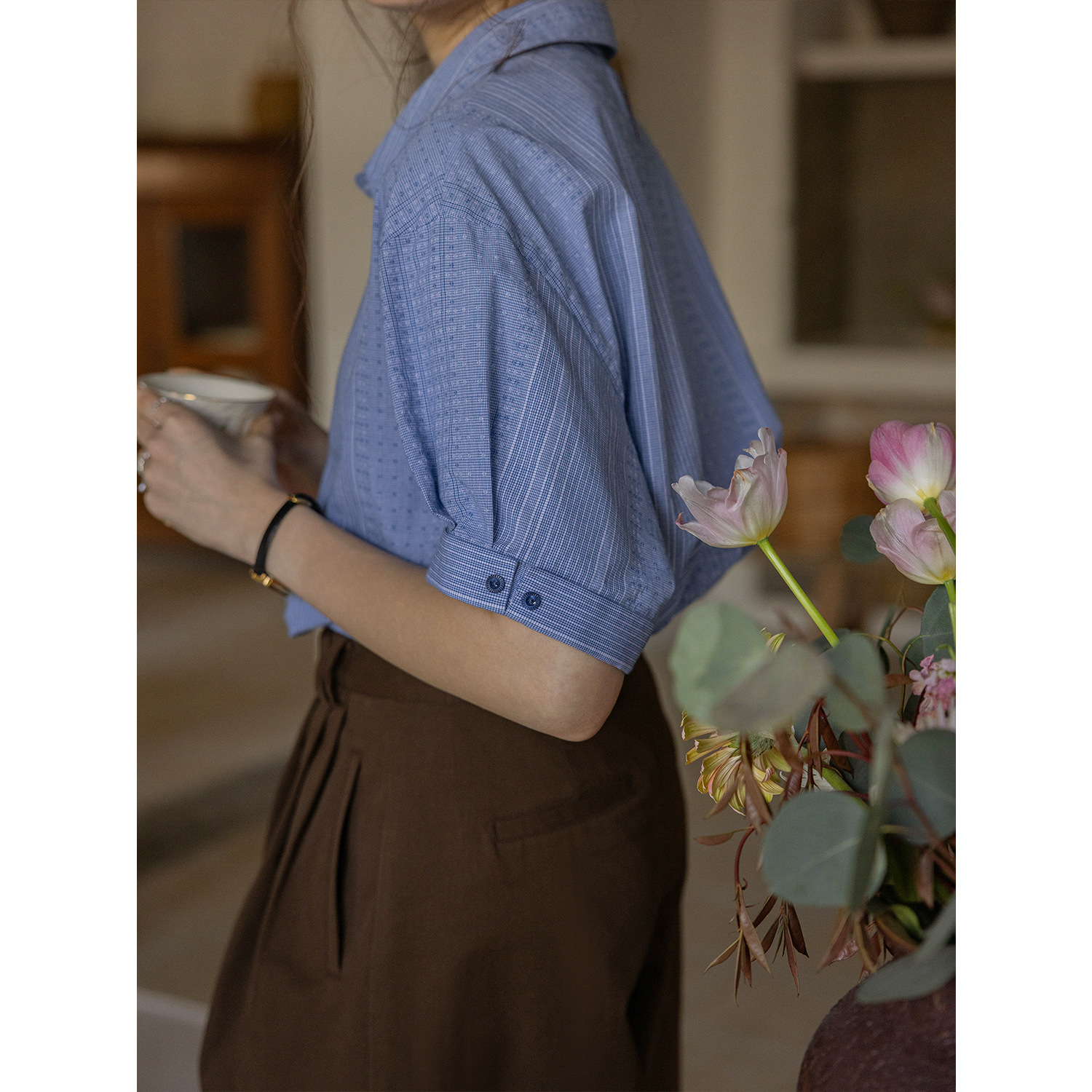 Dailyart“戛纳海诗”法式色织提花条纹宽松翻边门襟打条短袖衬衫