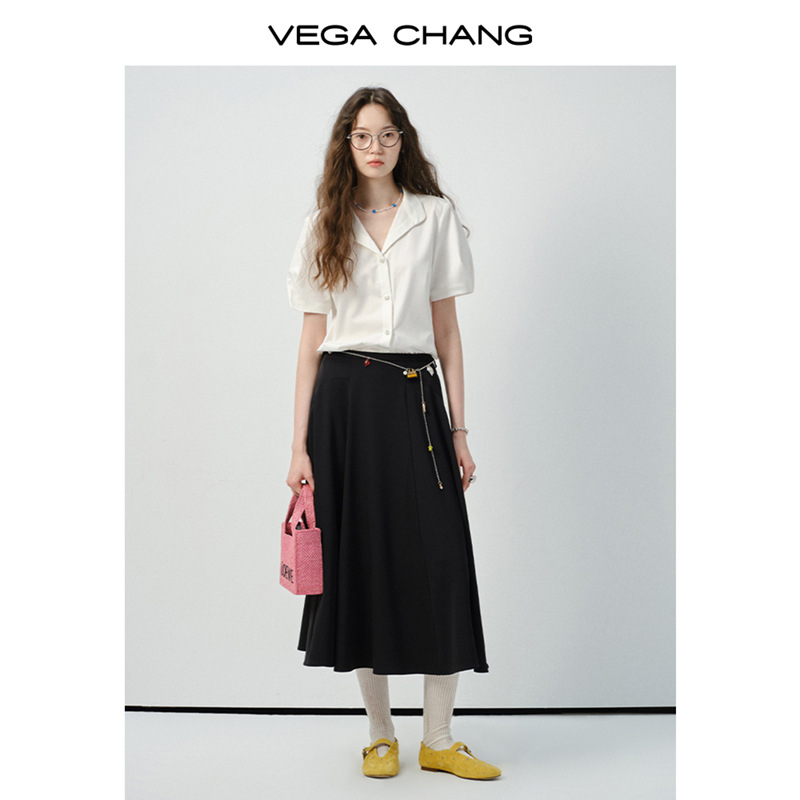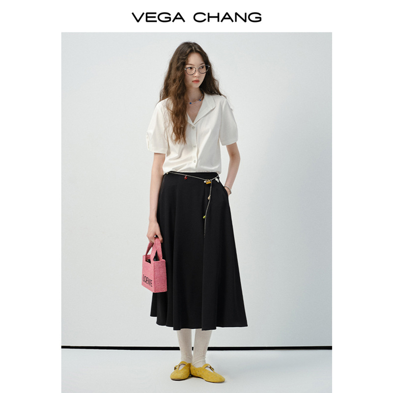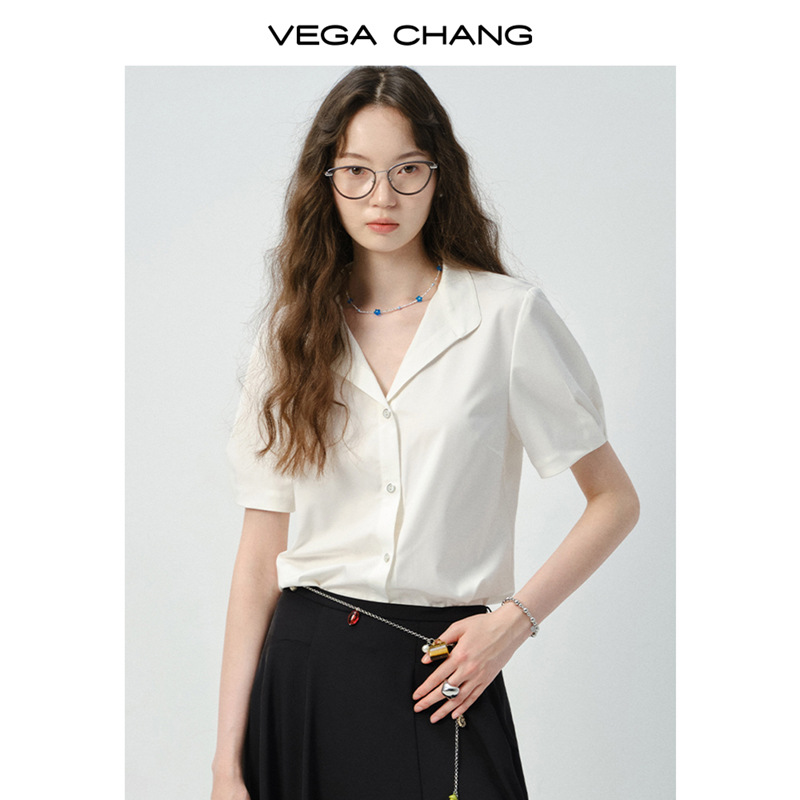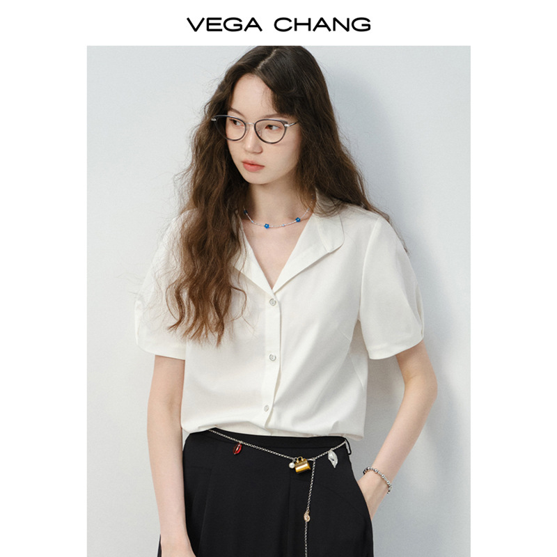VEGA CHANG短袖衬衫女2025新款夏通勤百搭翻V领设计简约休闲衬衣