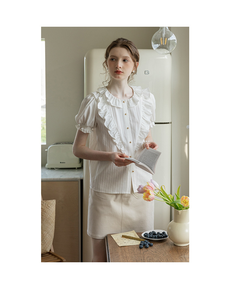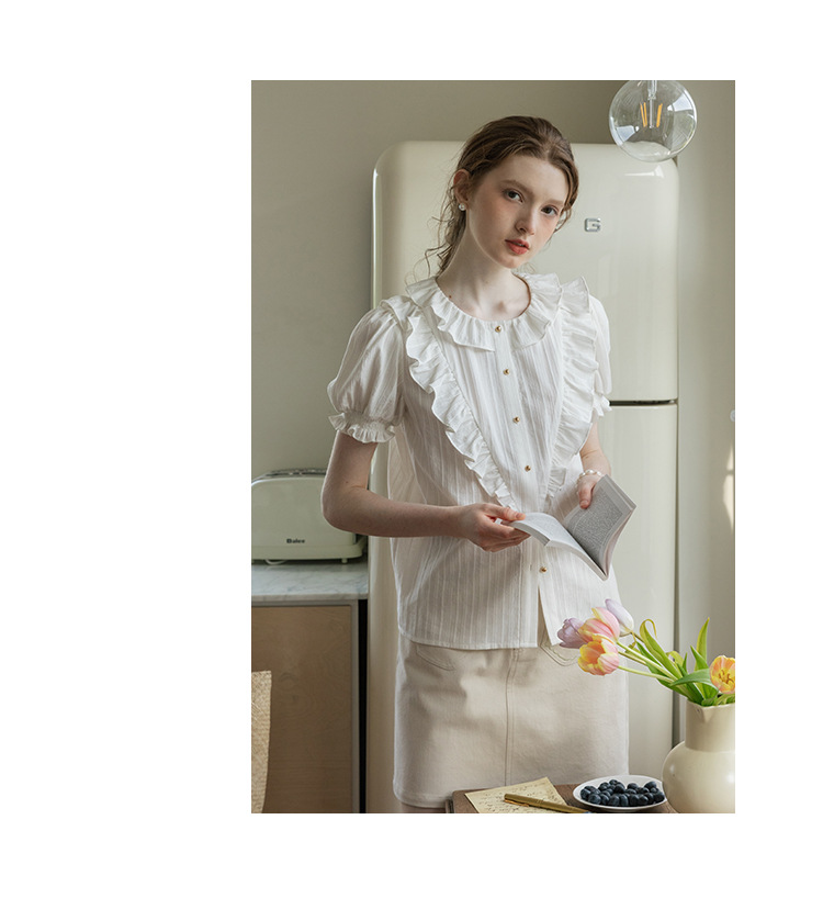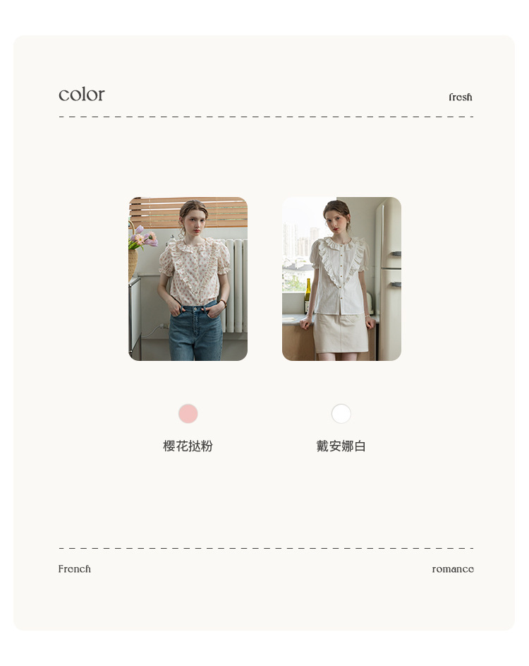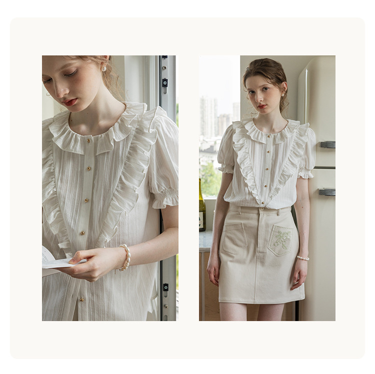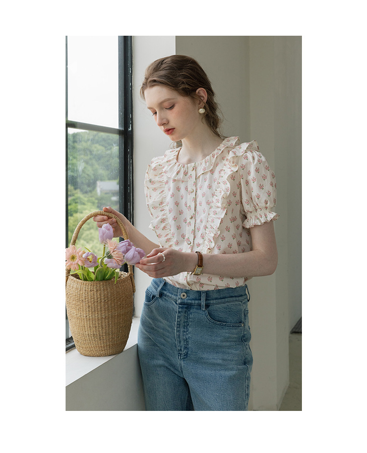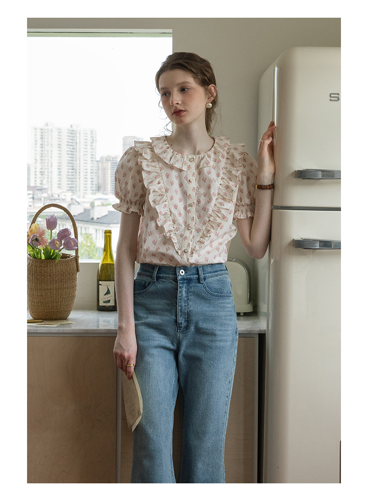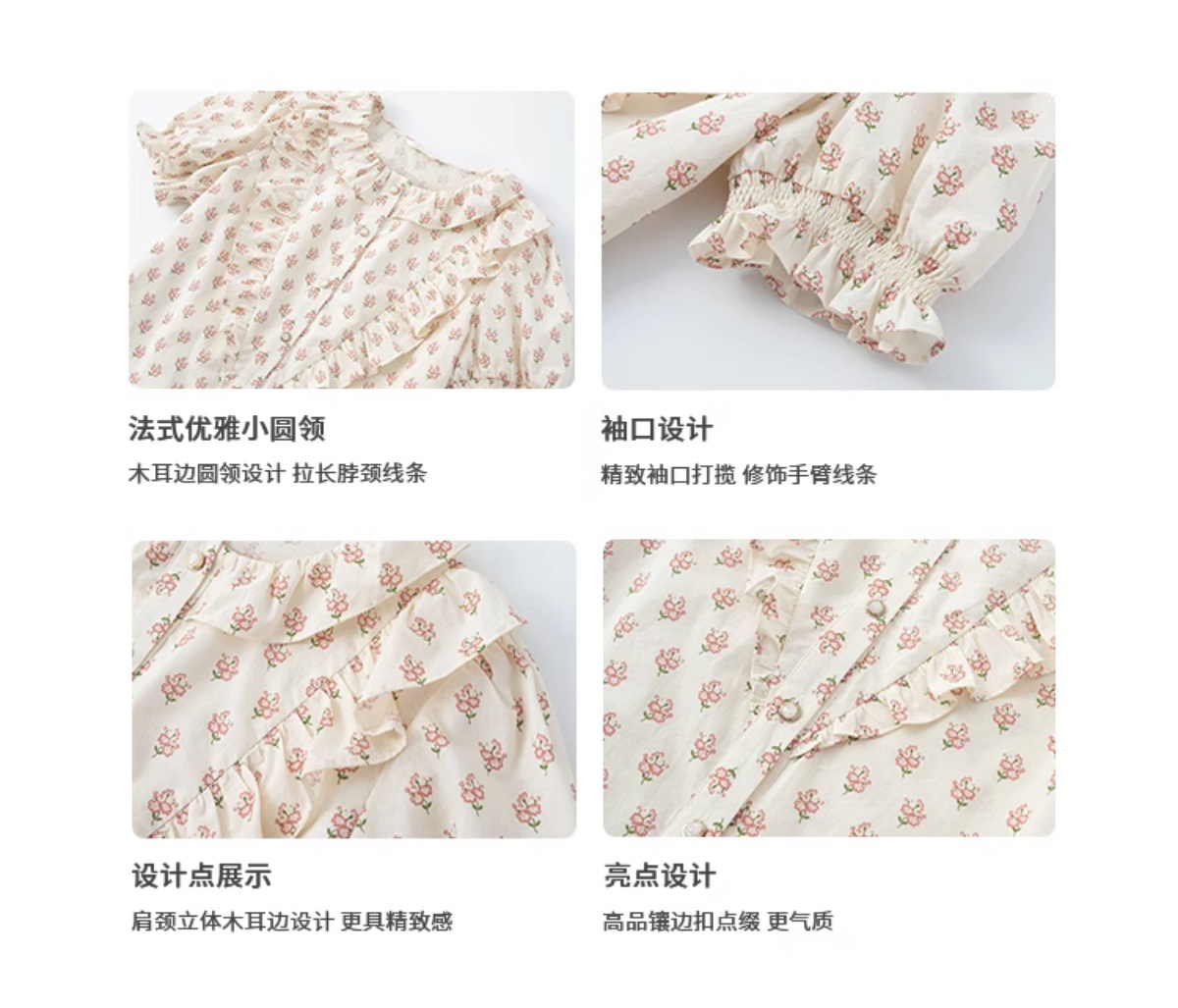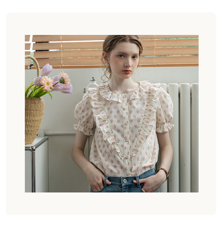 MELLIIY 2025新款法式木耳边拼接圆领粉色气质碎花短袖衬衫女夏款