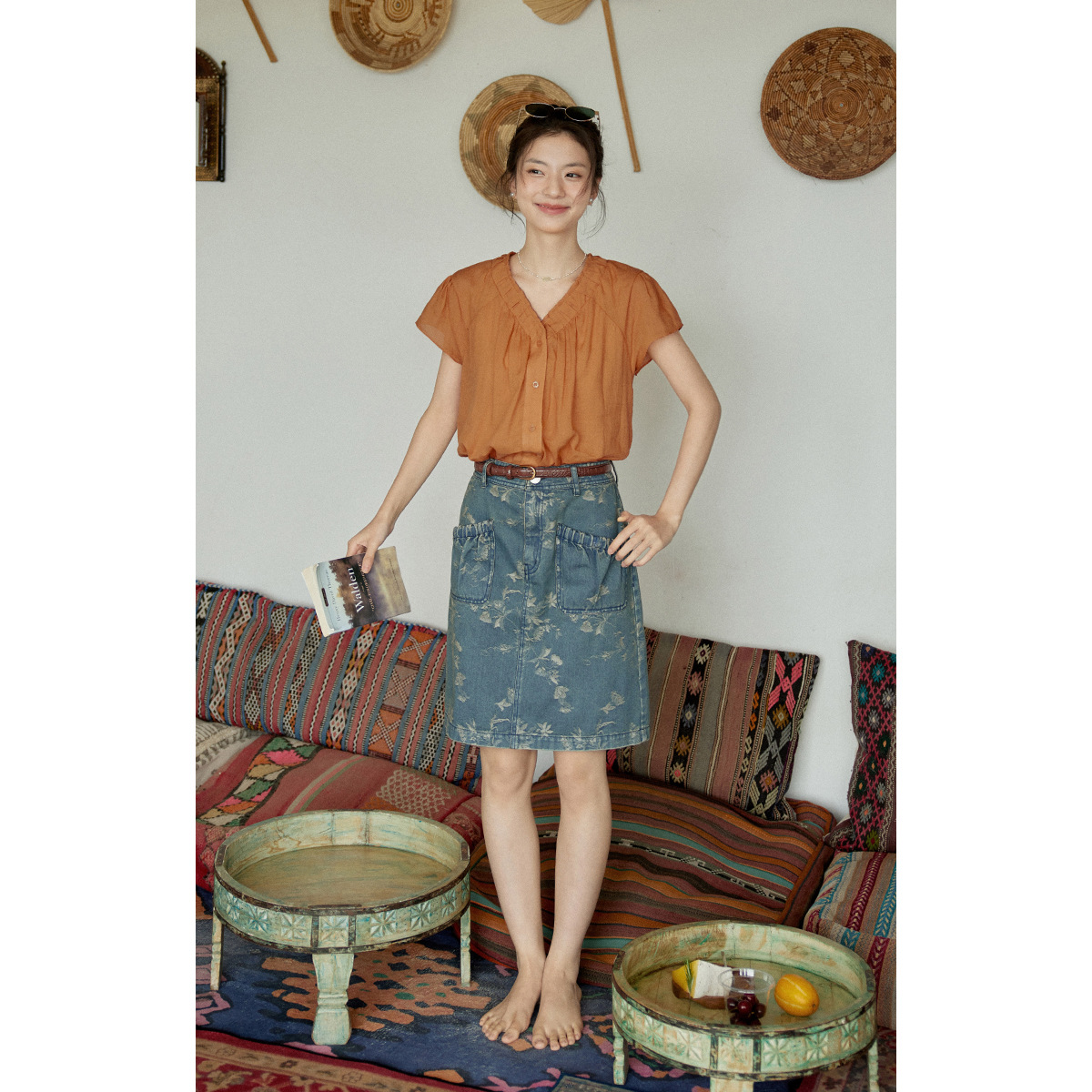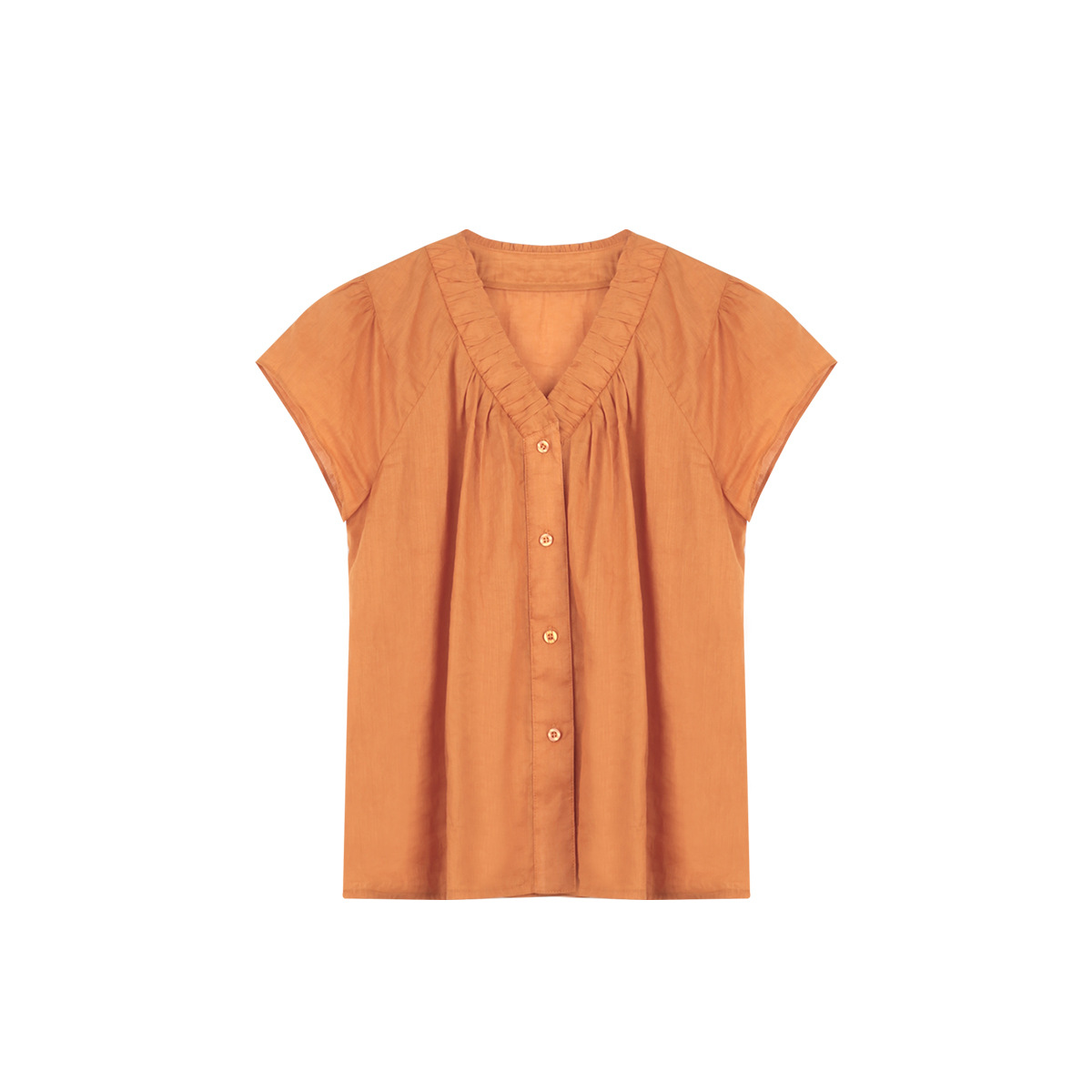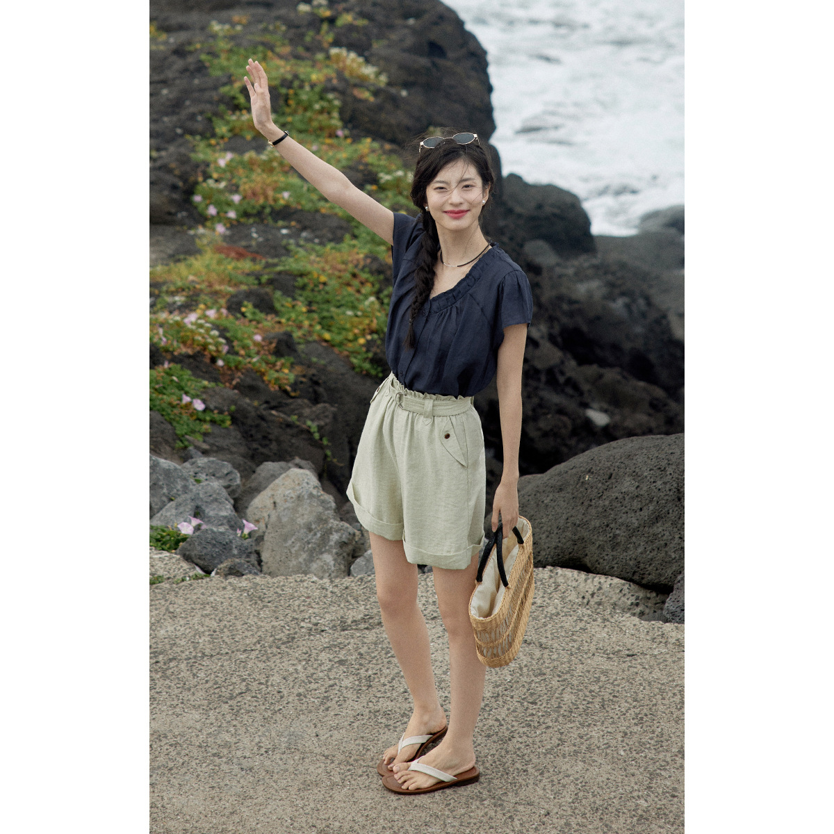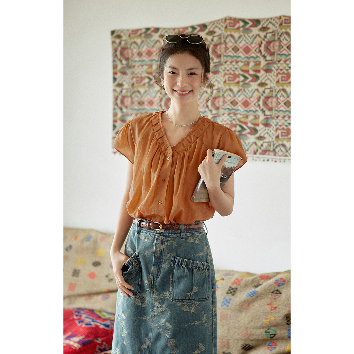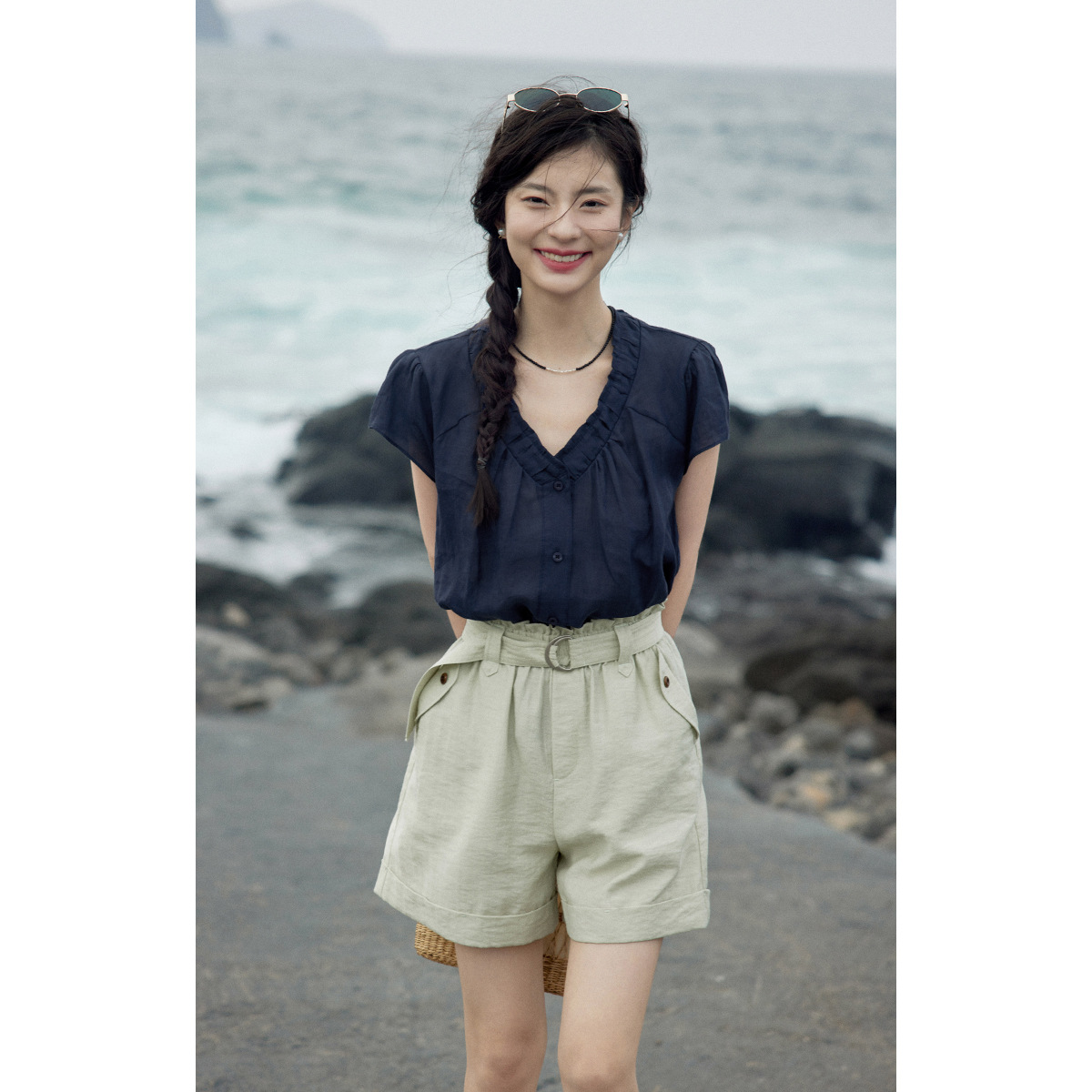 solighter 法式复古苎麻v领衬衫女夏季新款显瘦宽松衬衣上衣