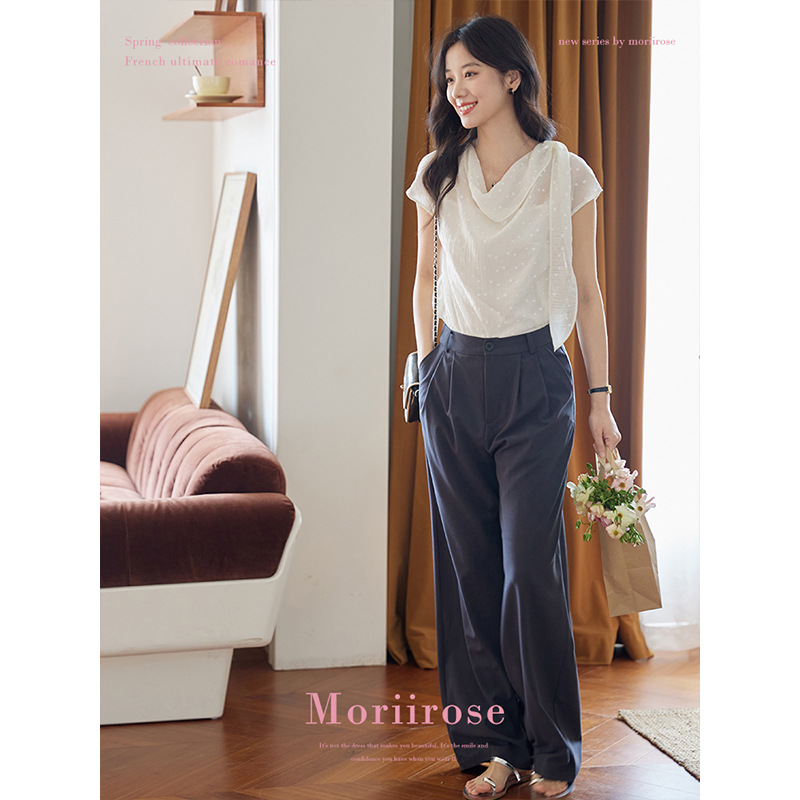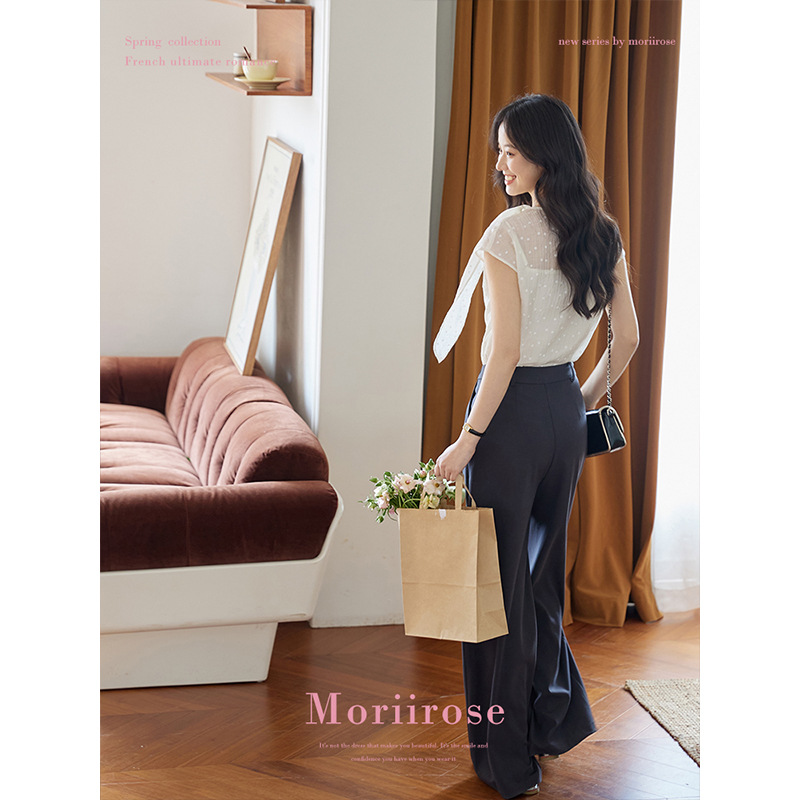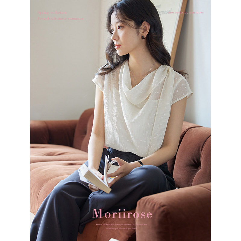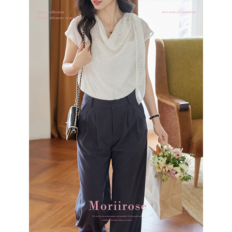Moriirose 白色荡领飘带点点印花天丝衬衫女夏季复古气质套头上衣