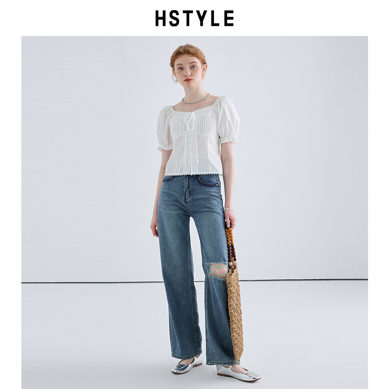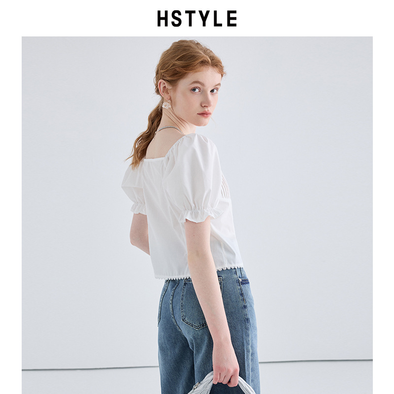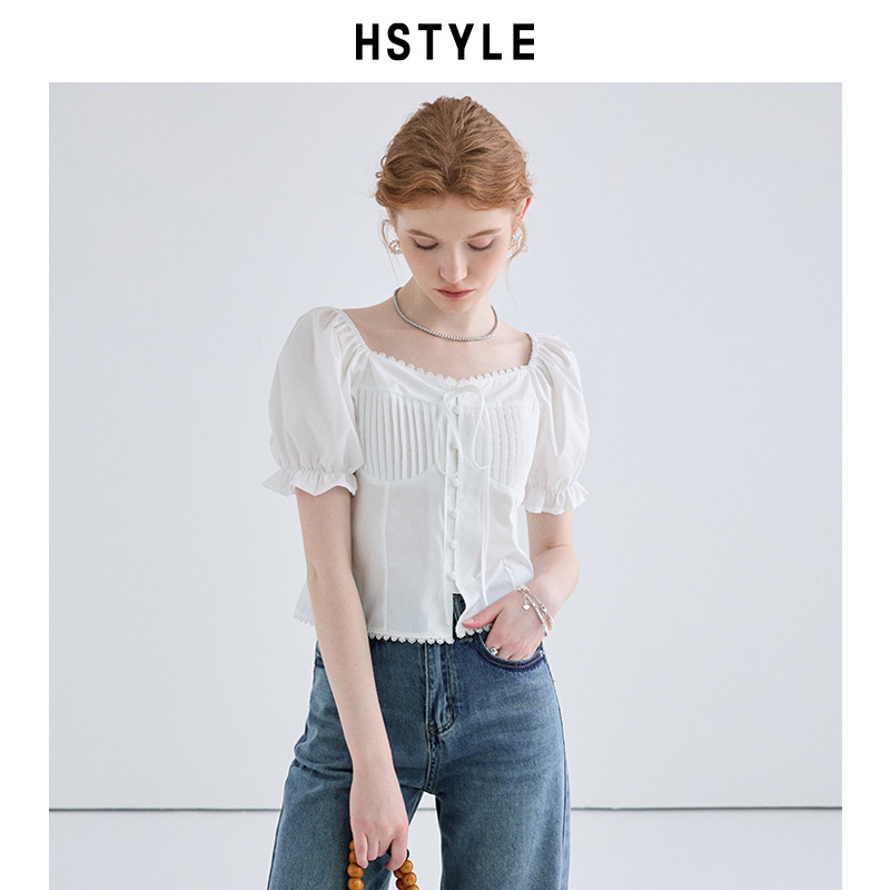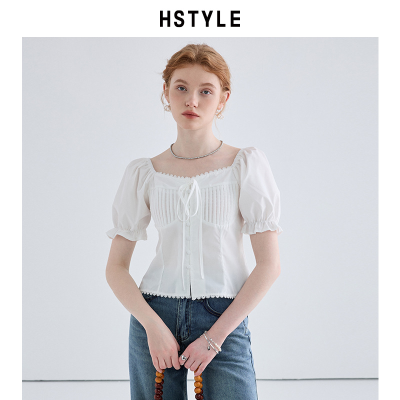 纯欲压褶花边系带方领短袖衬衫女时尚高级感百搭气质小衫
