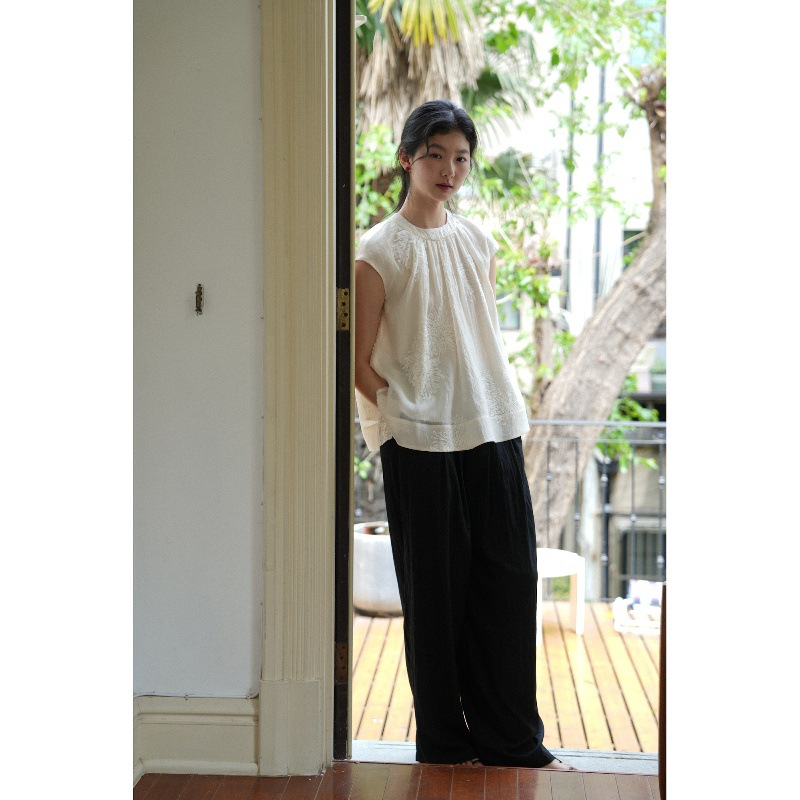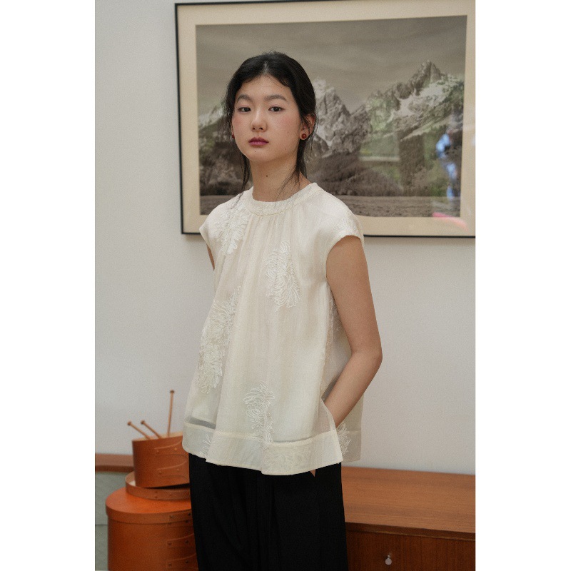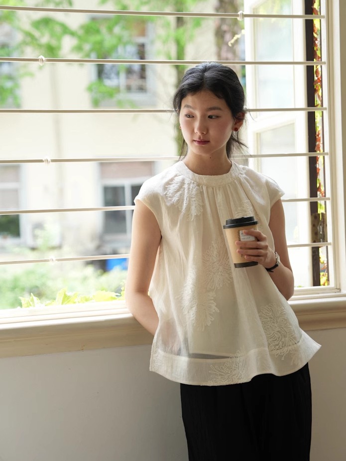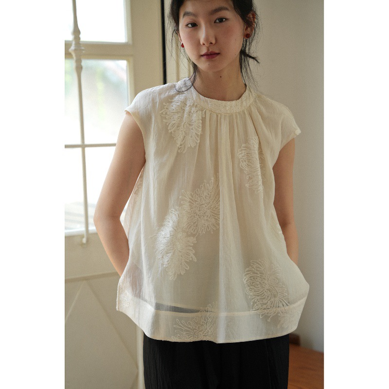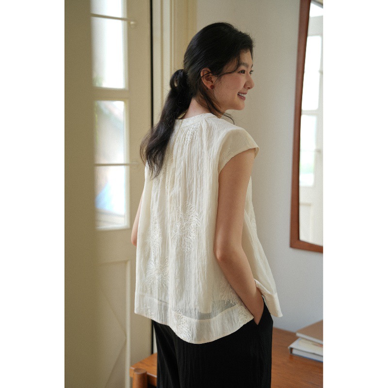 自然感受 新中式国风衬衫淡雅刺绣小衫圆领清凉无袖遮肉显瘦上衣