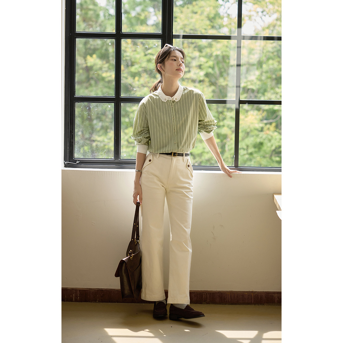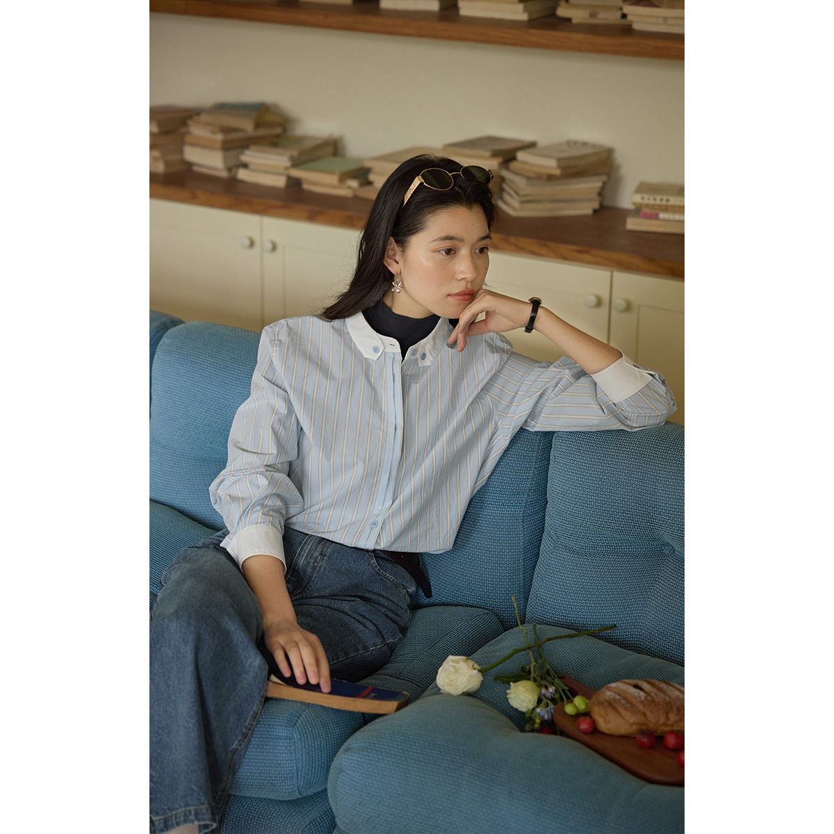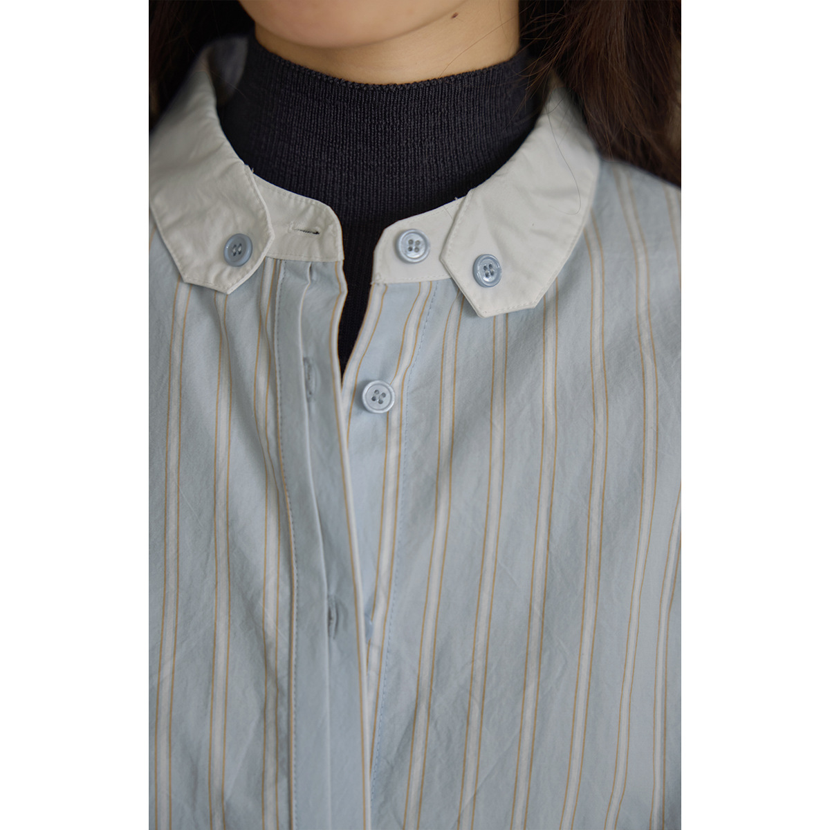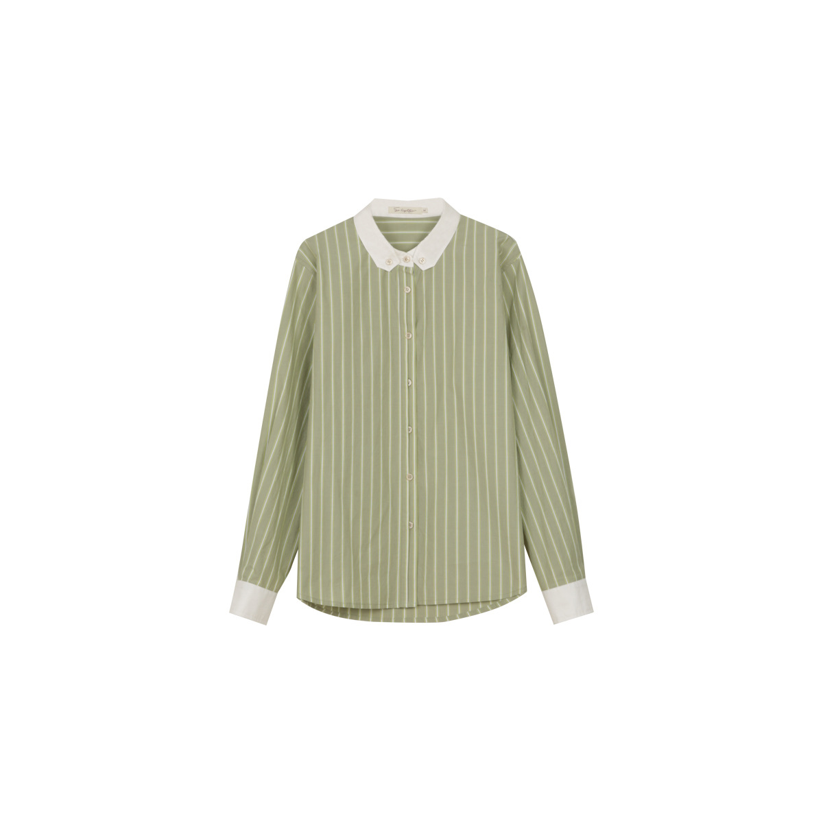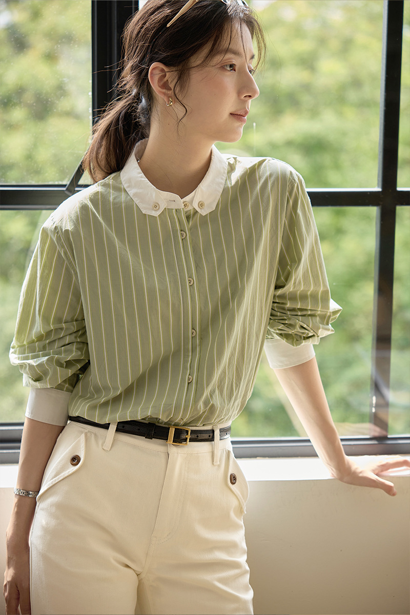 solighter 法式复古竖条纹长袖衬衫女春季新款撞色立领衬衣