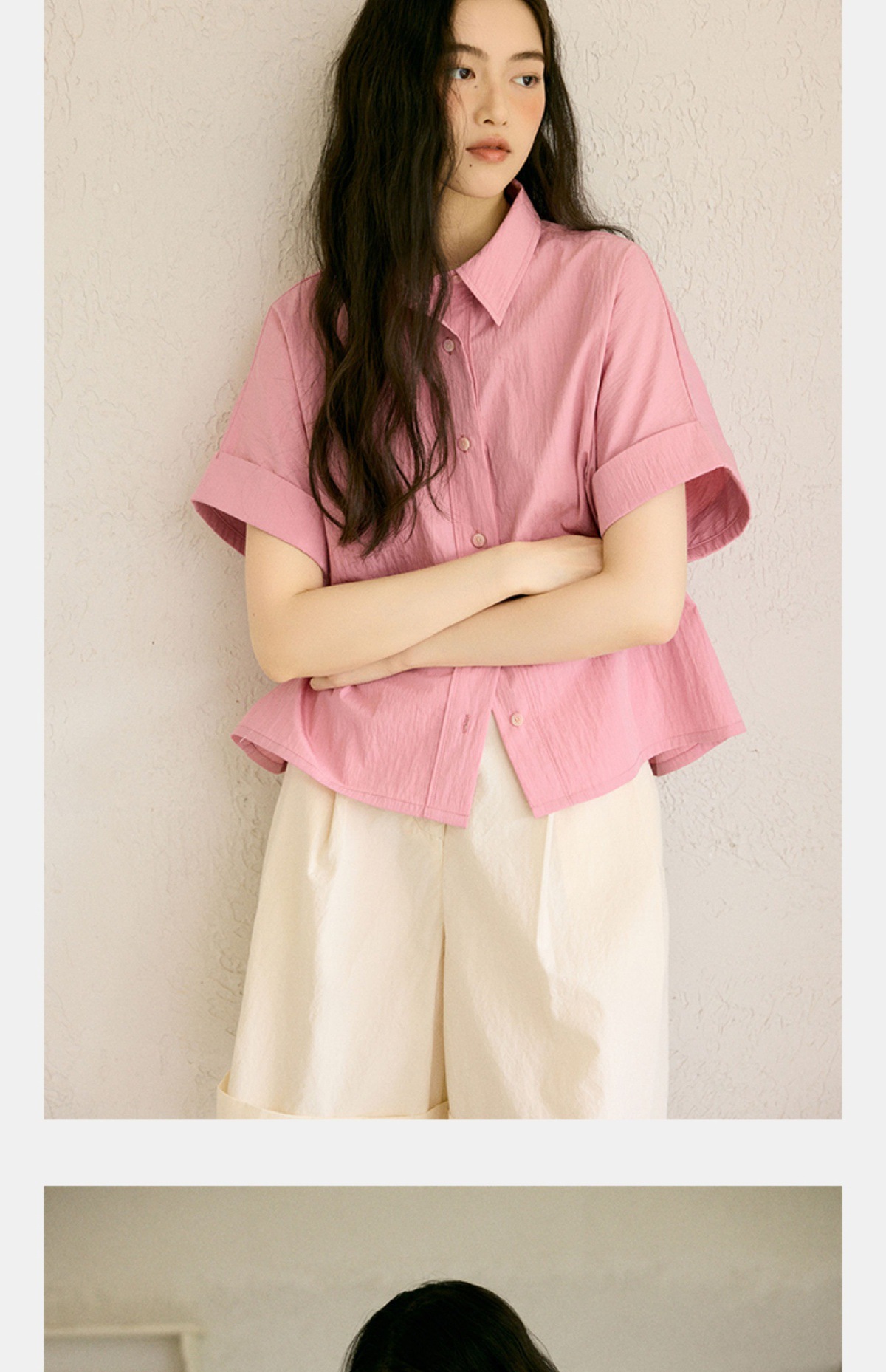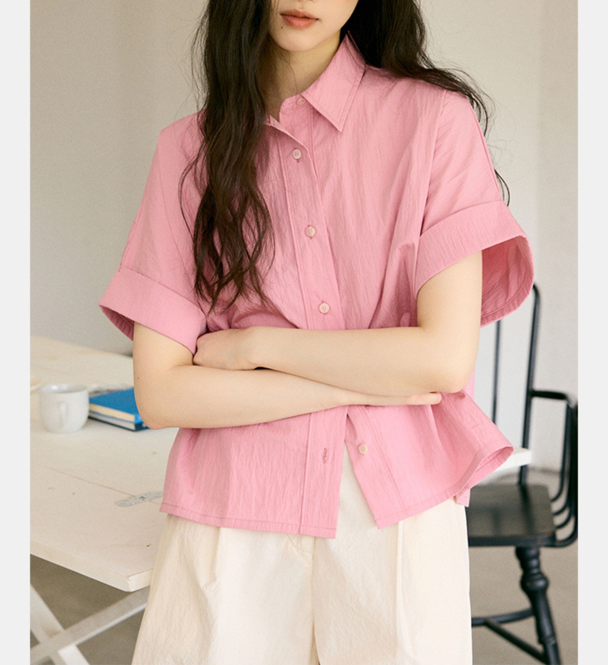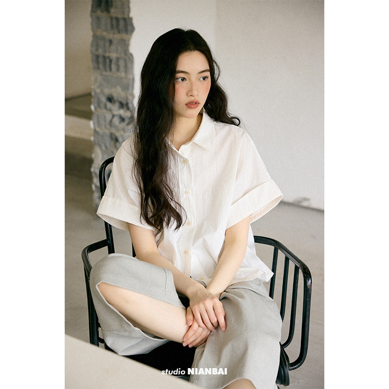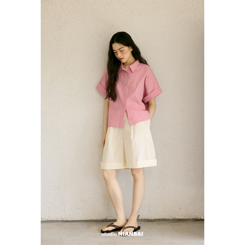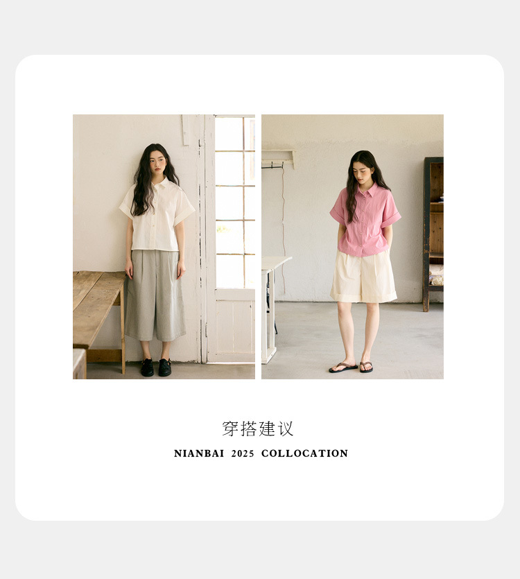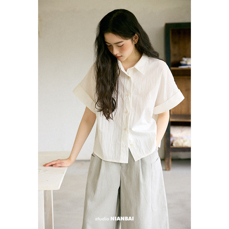 绉感肌理经典宽门襟短款翻边短袖衬衫NC3086