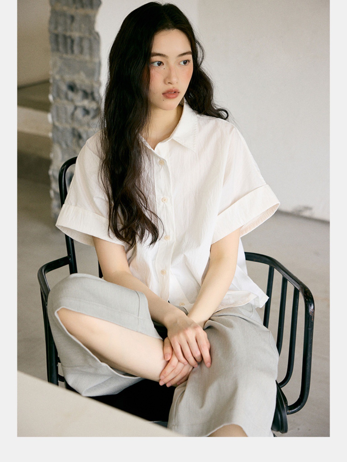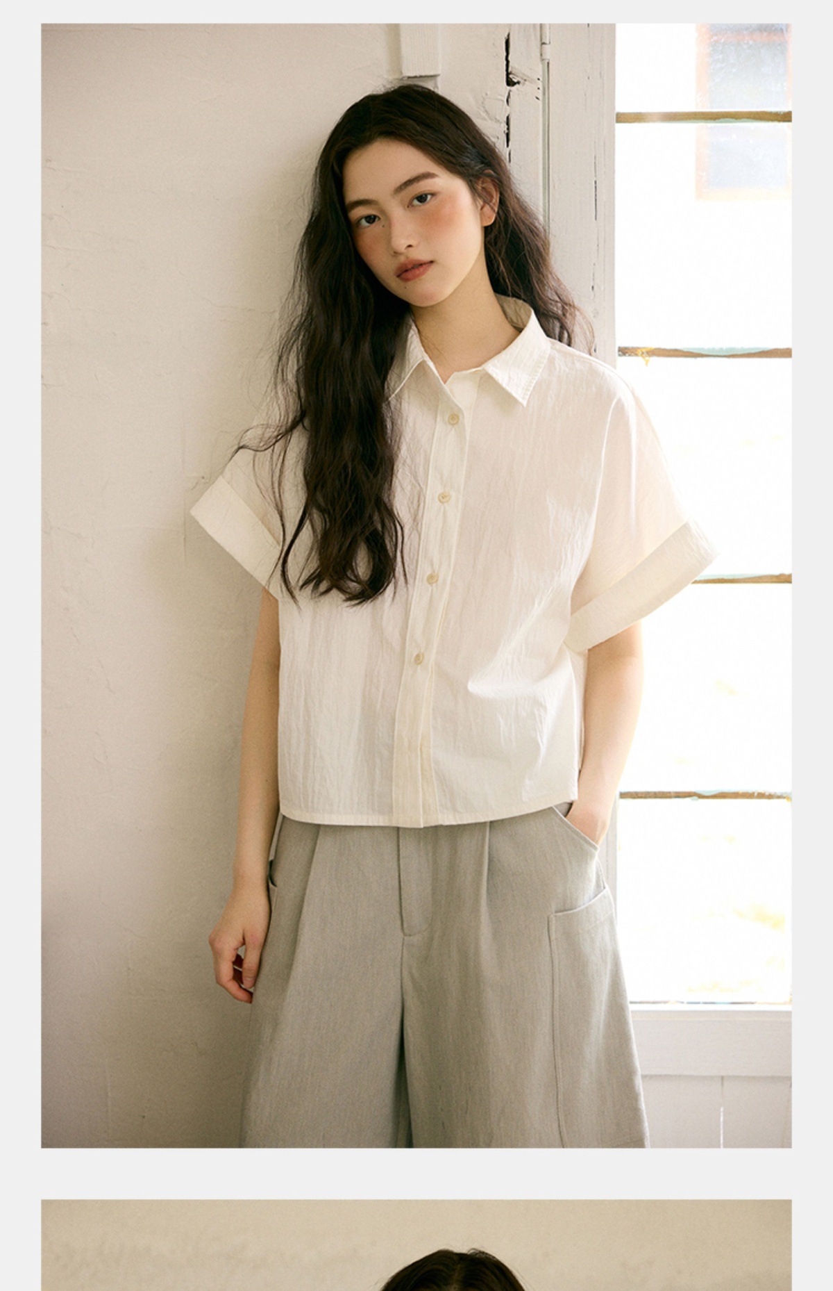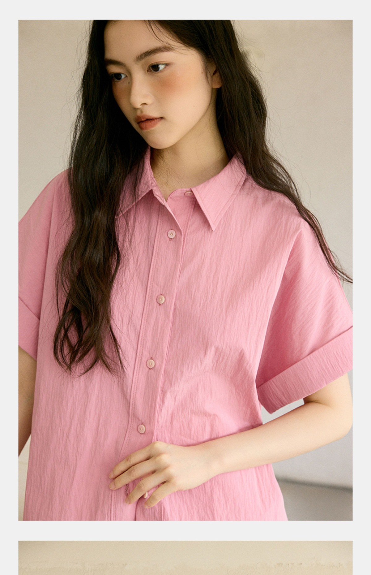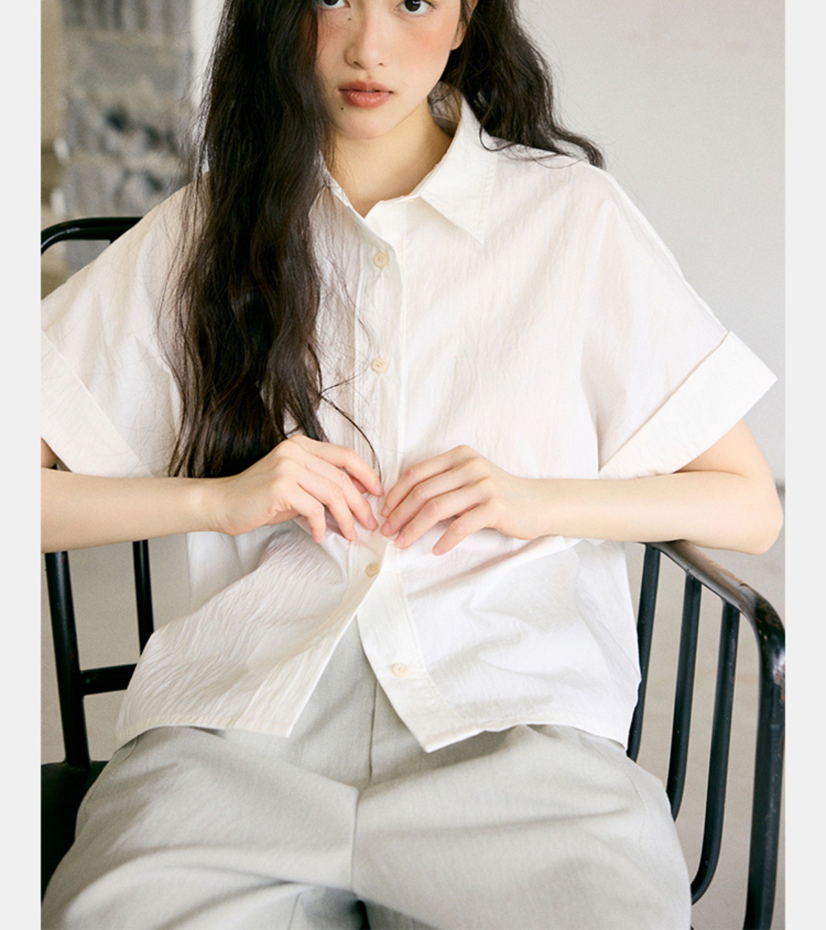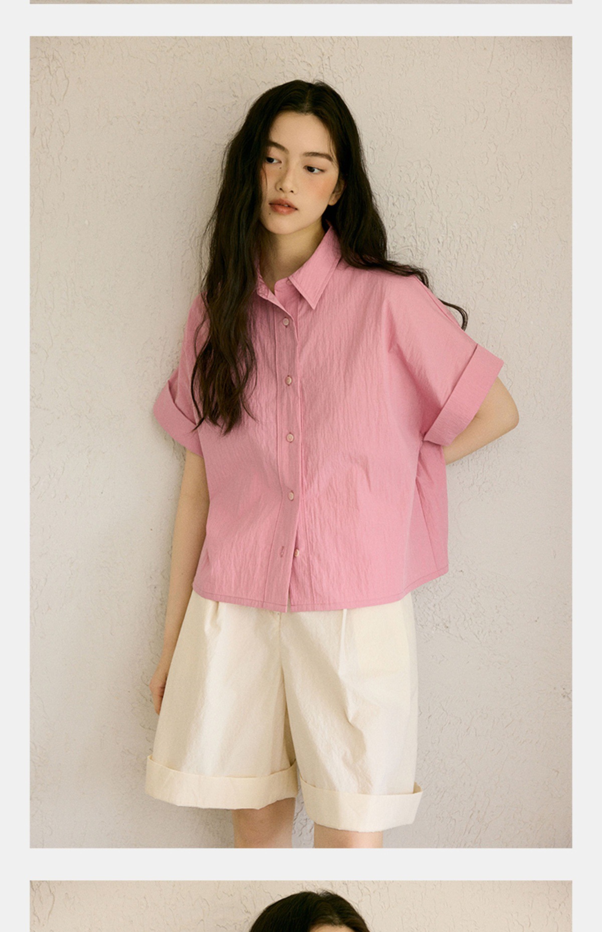 绉感肌理经典宽门襟短款翻边短袖衬衫NC3086