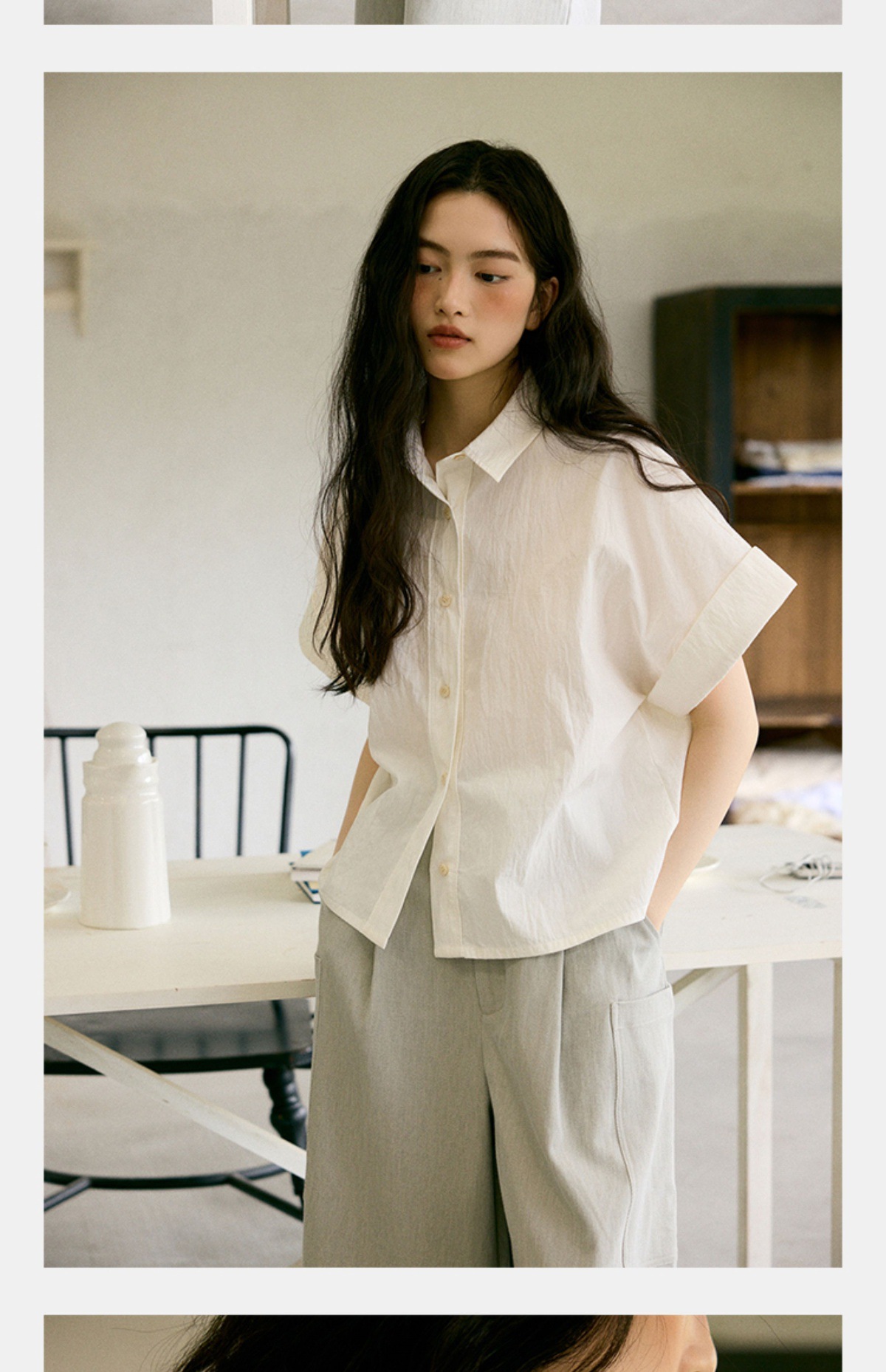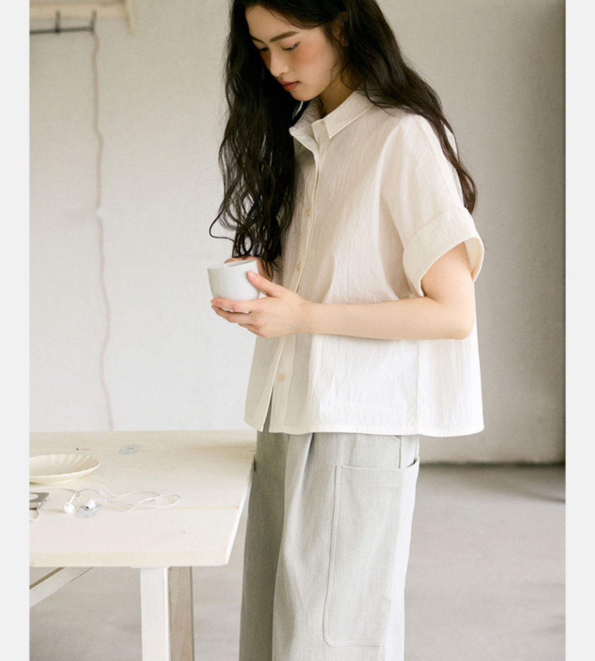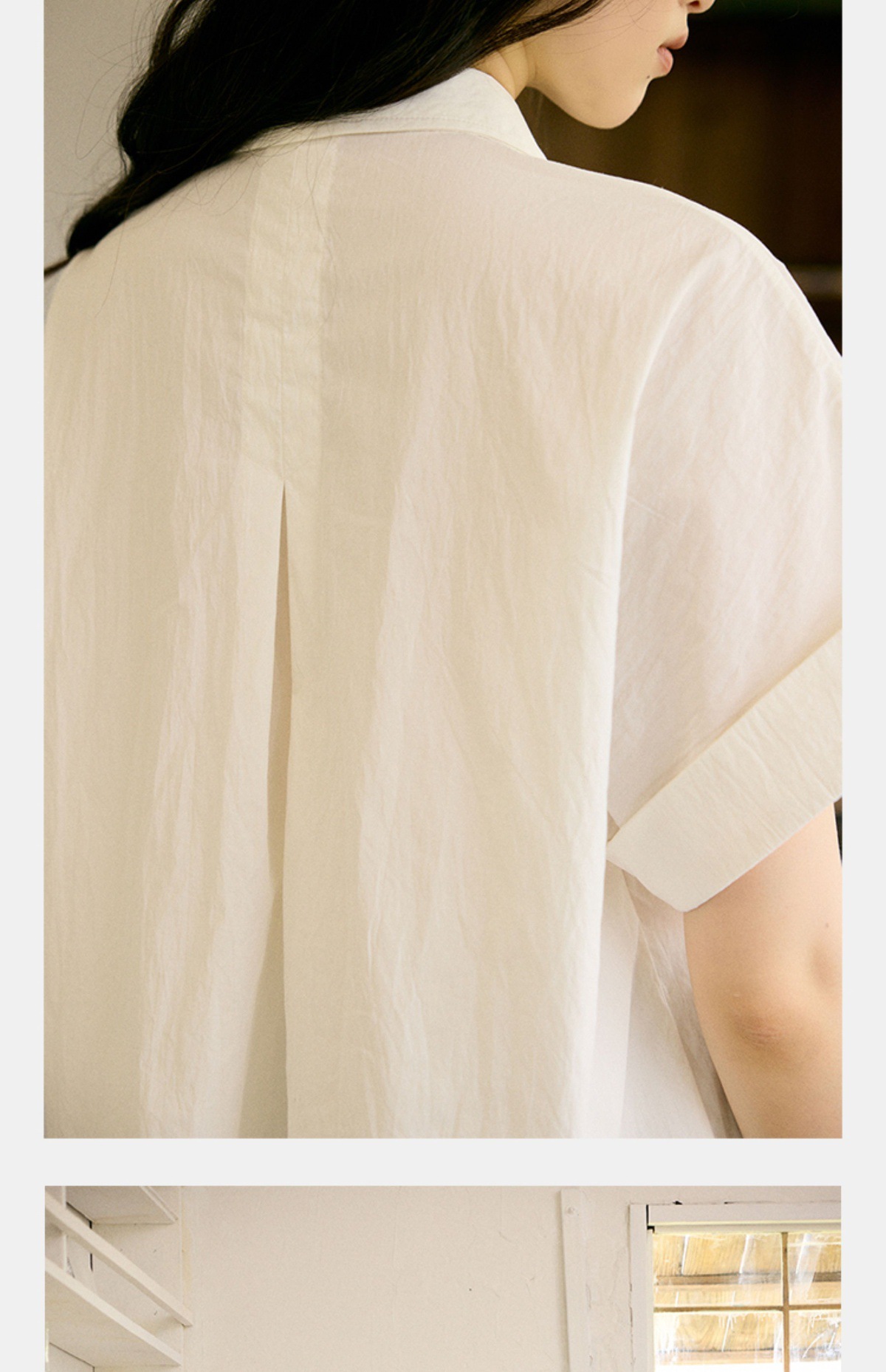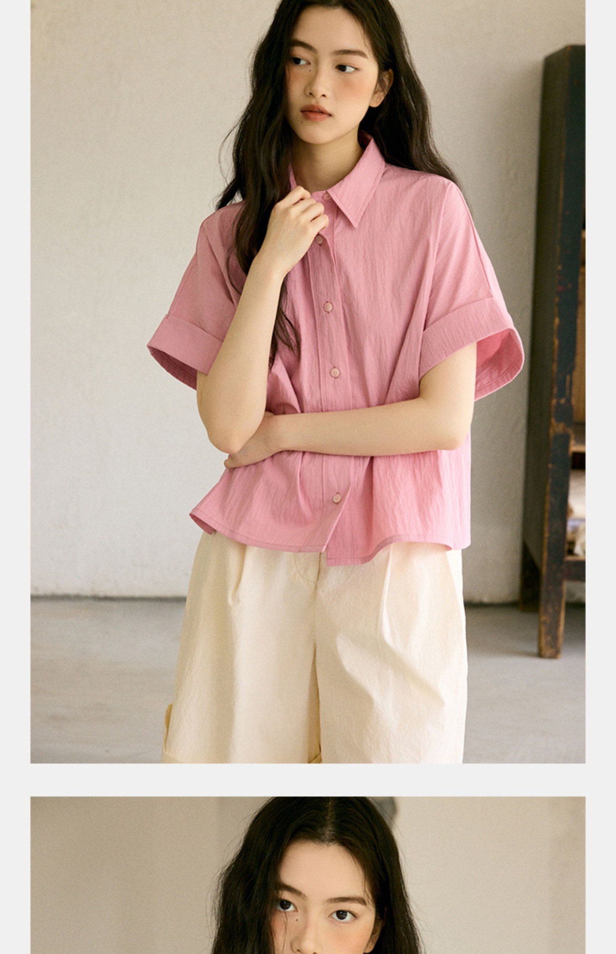 绉感肌理经典宽门襟短款翻边短袖衬衫NC3086
