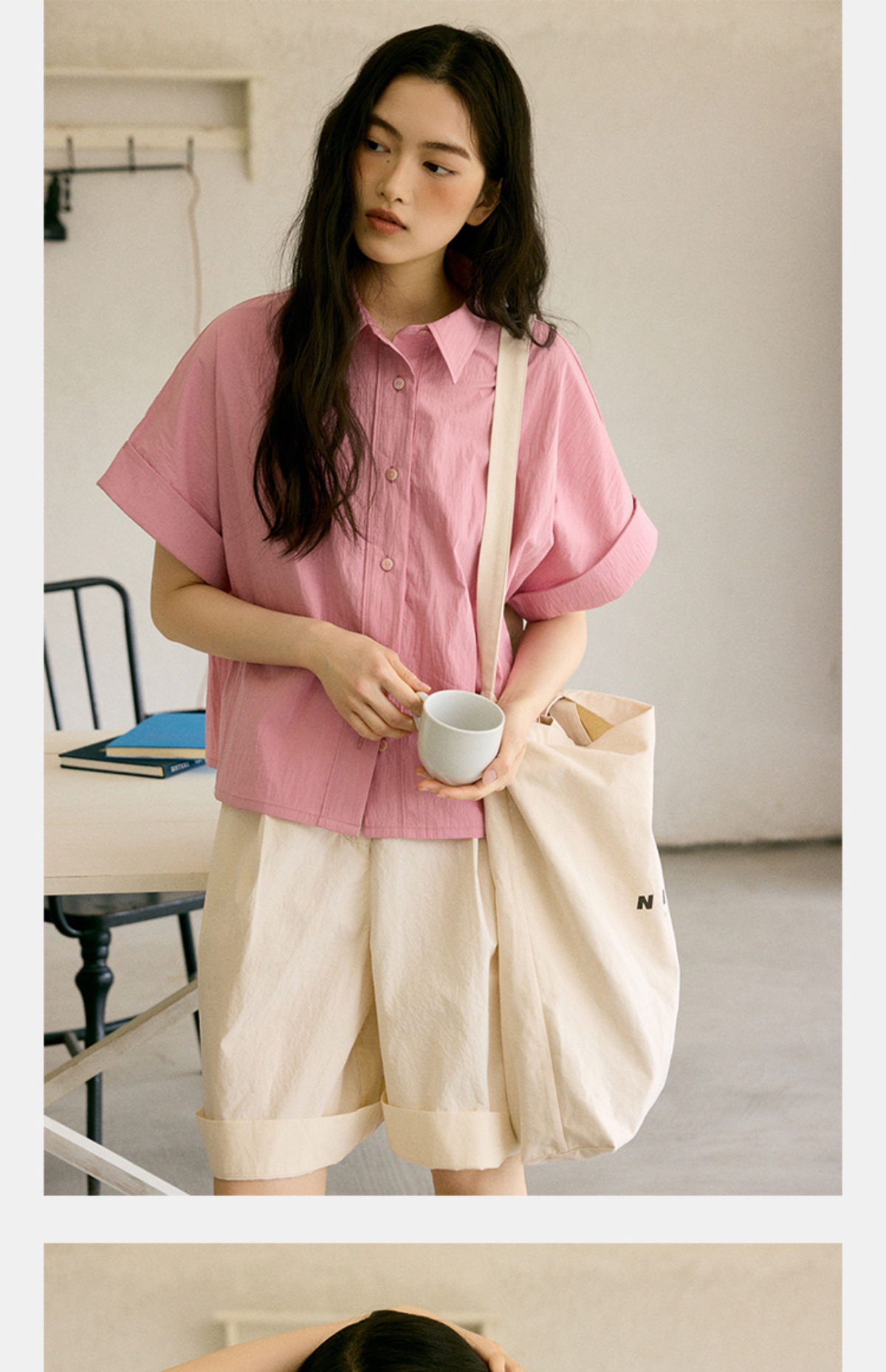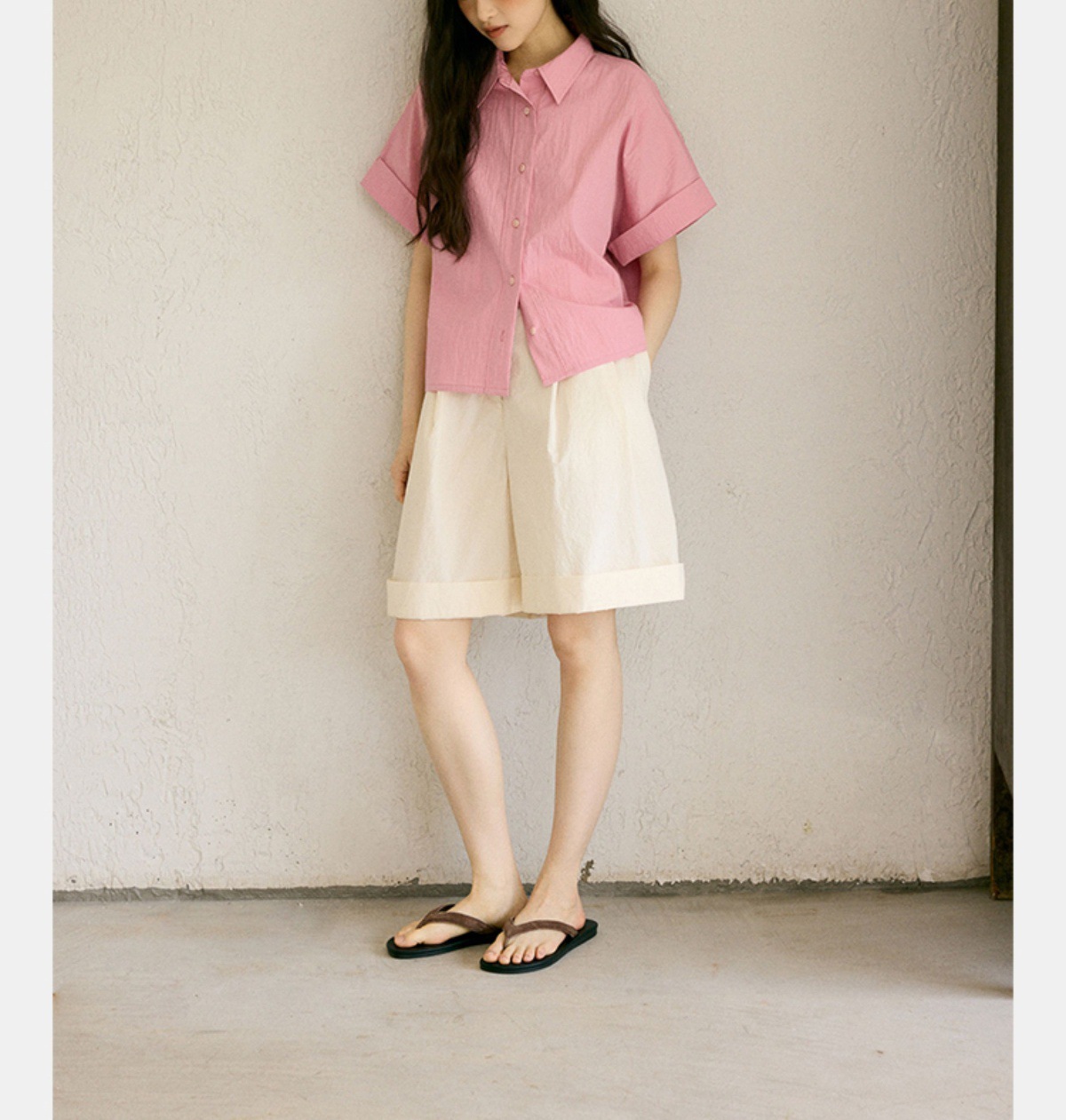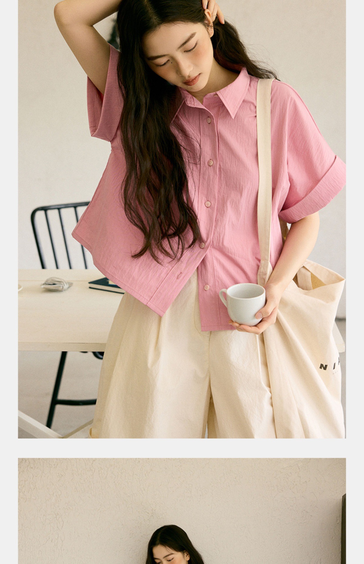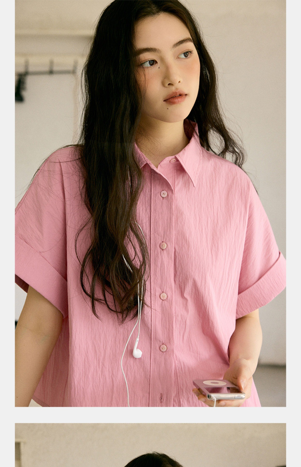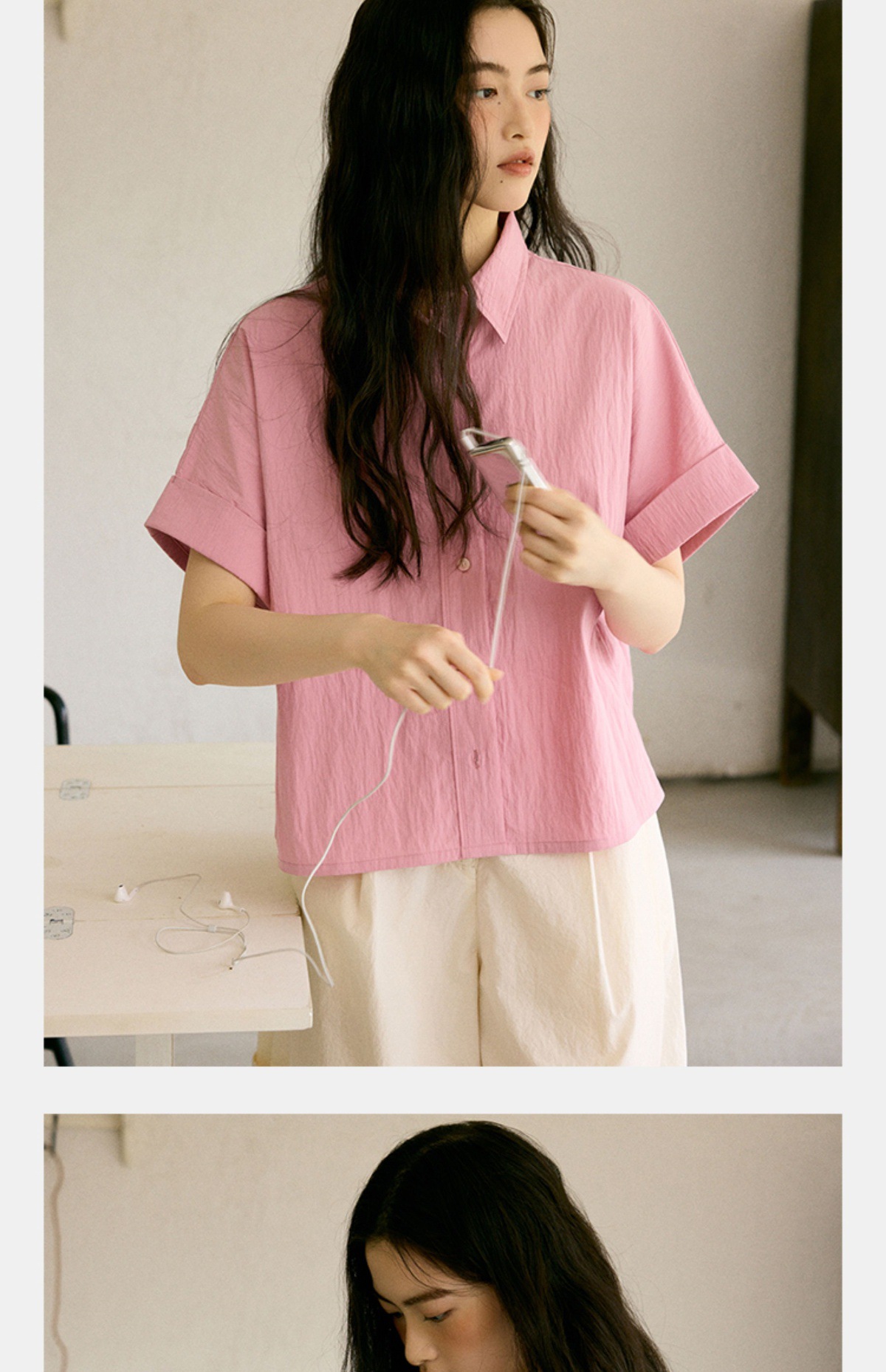 绉感肌理经典宽门襟短款翻边短袖衬衫NC3086
