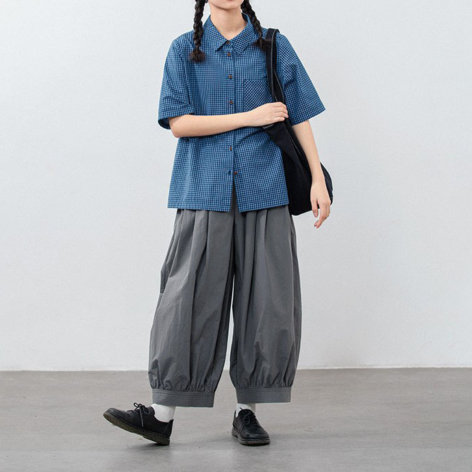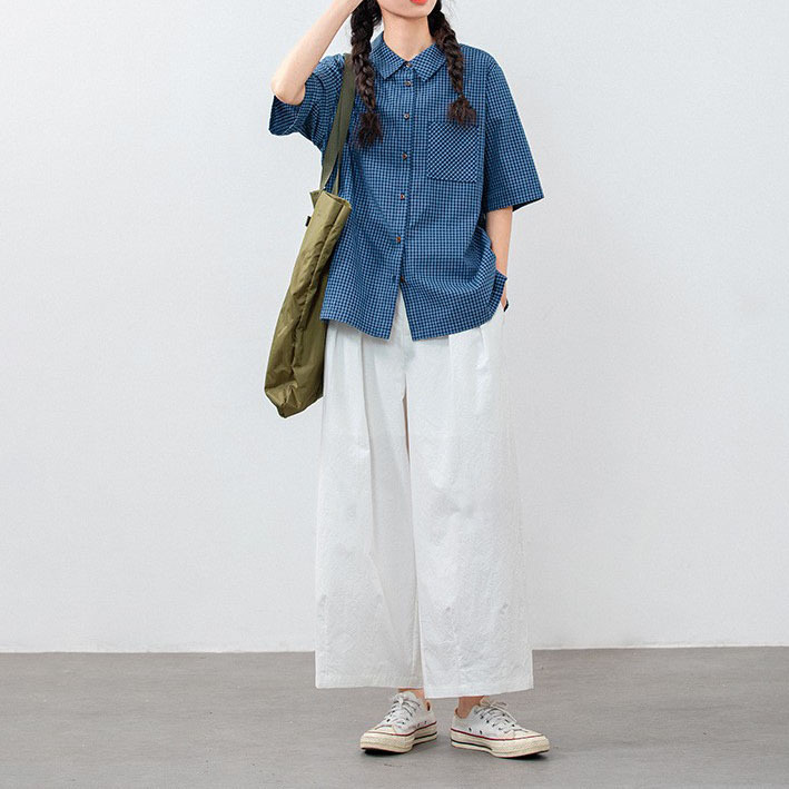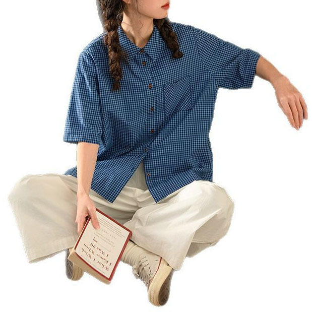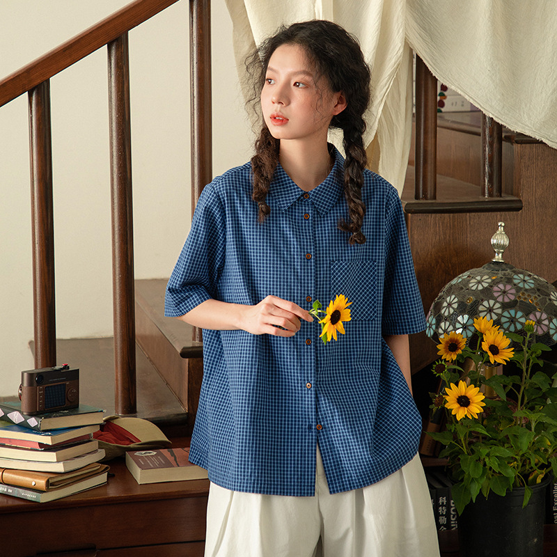 复古蓝色格子衬衫女夏季薄款日系休闲上衣翻领衬衣