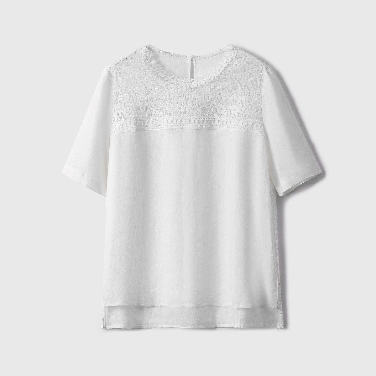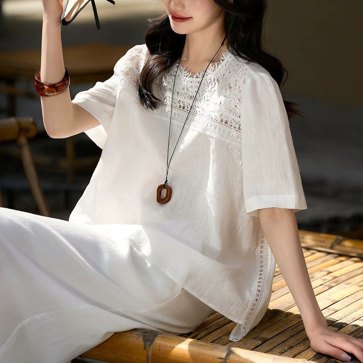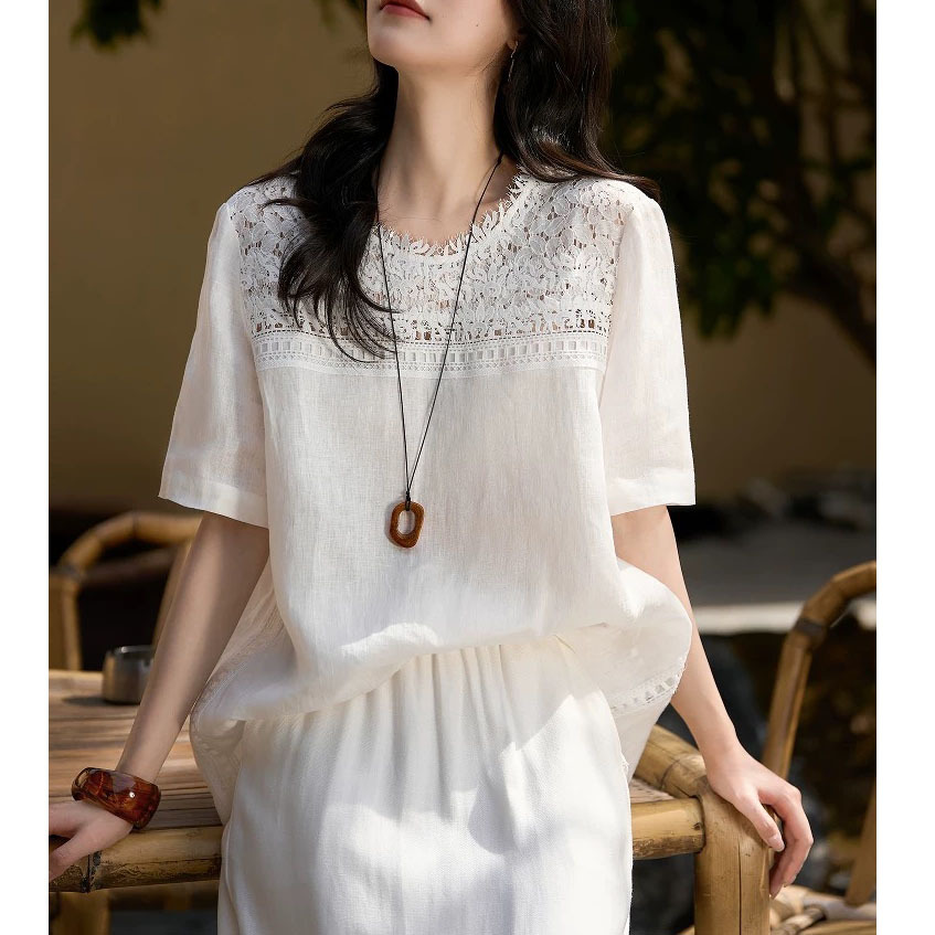 一梦浮生重工蕾丝+亚麻半袖衬衫宽松圆领女上衣25夏新ょ