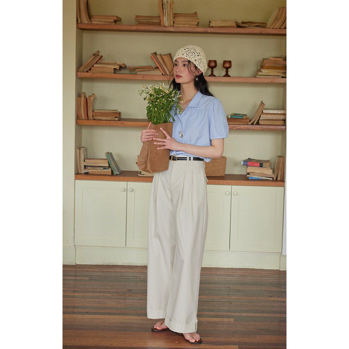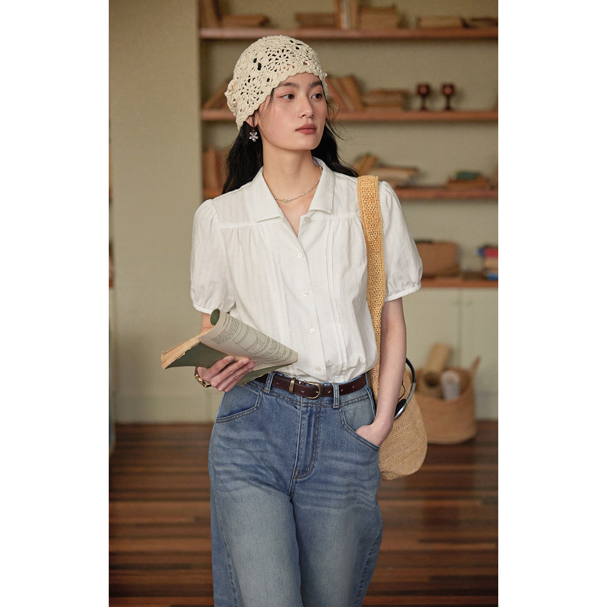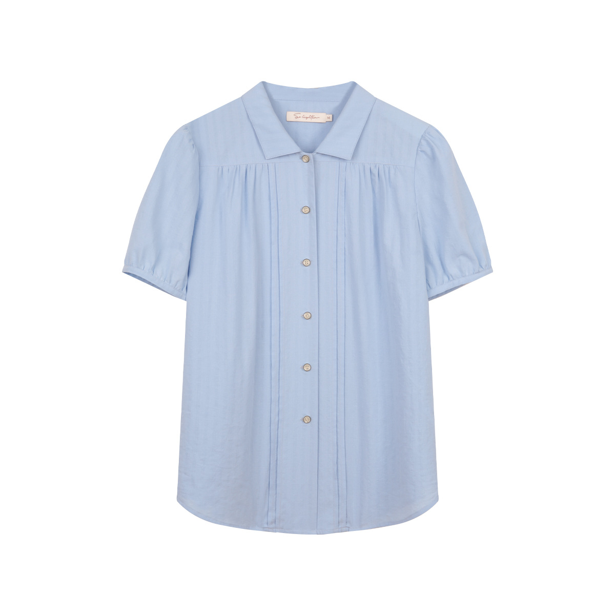 solighter 法式蓝色泡泡袖衬衫女夏季2025新款宽松翻领短袖上衣