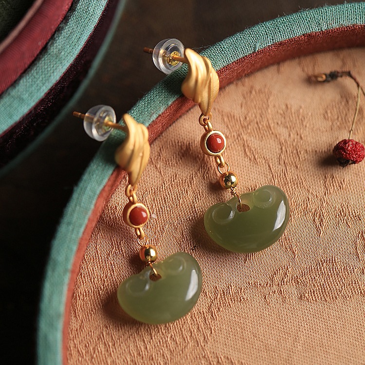 原创和田如意平安锁纯银古法金复古耳环女中国风耳坠耳饰