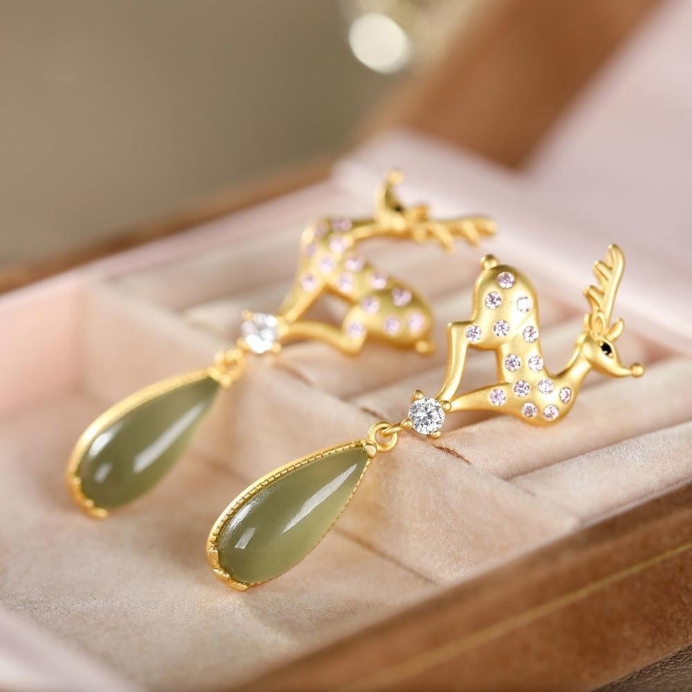 S925纯银镶嵌天然和田青玉梅花鹿水滴时尚个性女和田坠耳饰