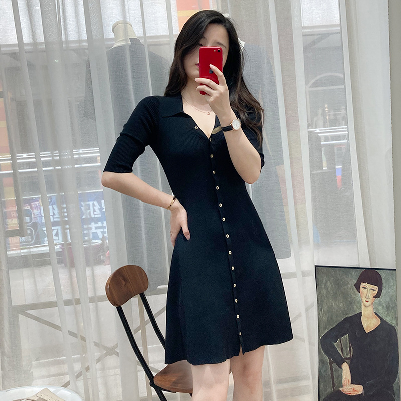 M家优雅修身显瘦针织连衣裙法式女气质V领赫本风小黑裙夏小众轻奢