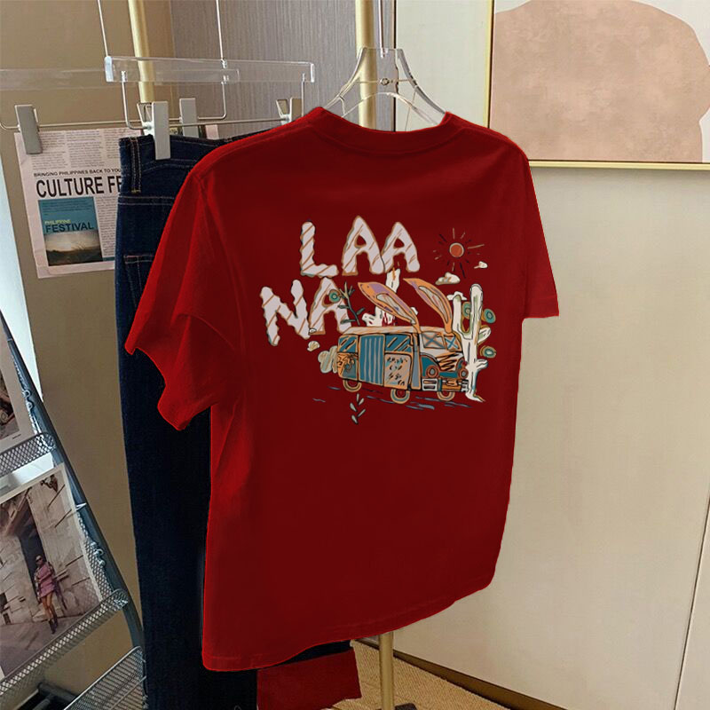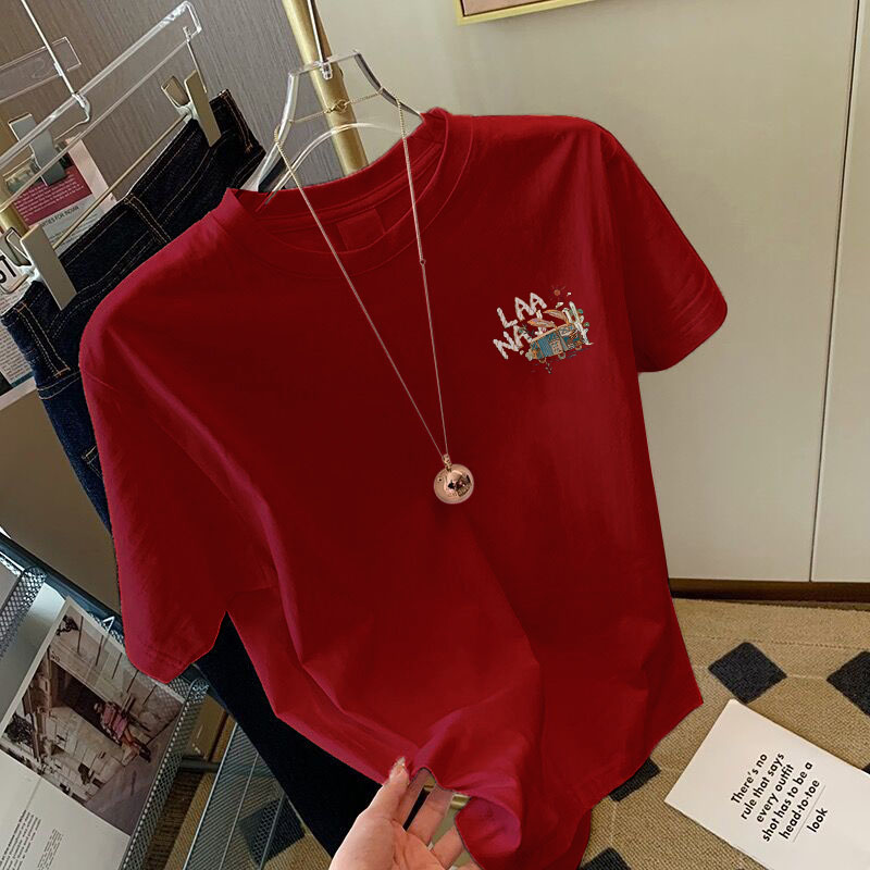 2025夏季新款设计感正肩纯棉显白红色短袖t恤女宽松百搭卡通上衣