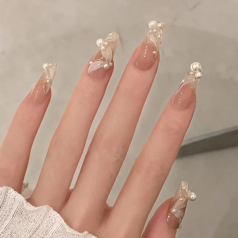 素雅冰透浅色美甲贴片珍珠丝带中长芭蕾甲穿戴甲片自然贴合假指甲