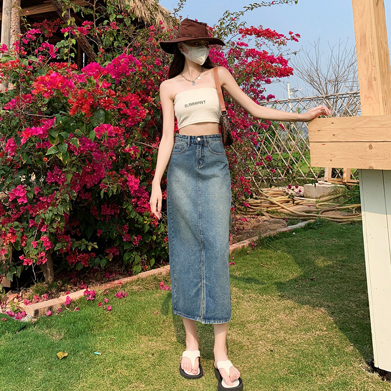 高端复古蓝开叉牛仔半身裙女2025春夏新款高腰显瘦包臀a字中长款