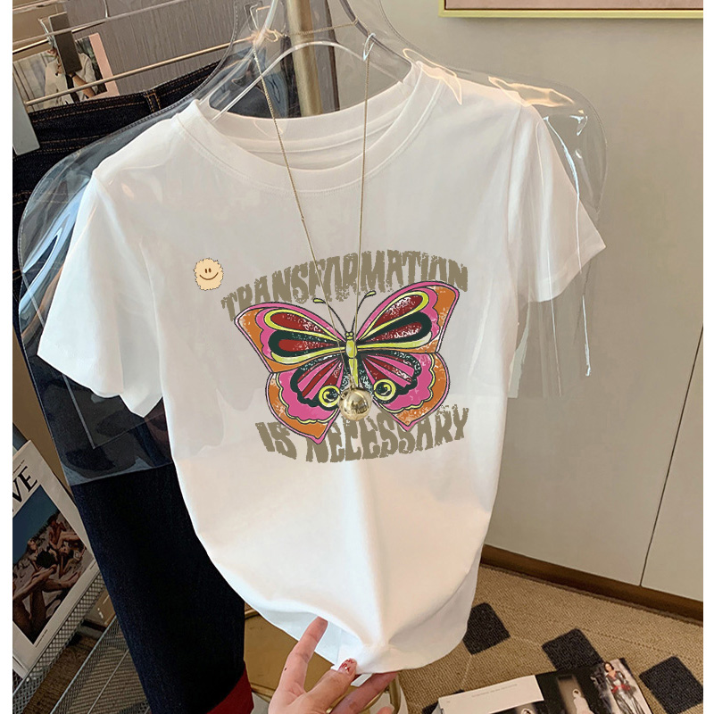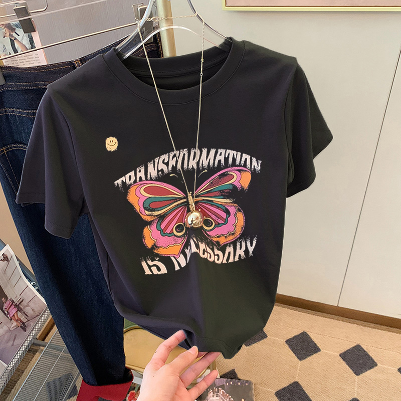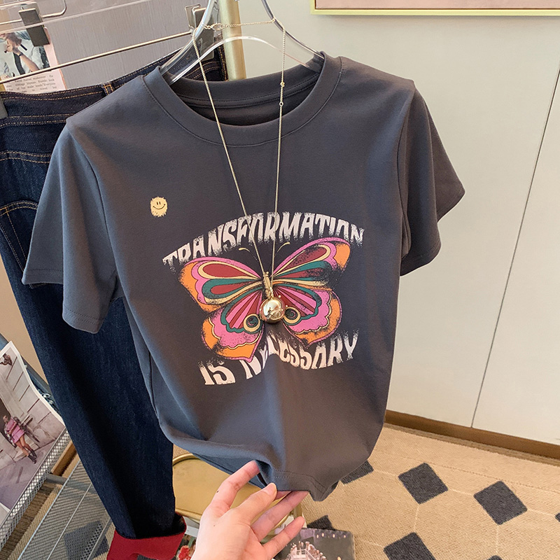 2025夏季新款灰色蝴蝶印花纯棉短袖t恤女宽松百搭正肩质感上衣潮