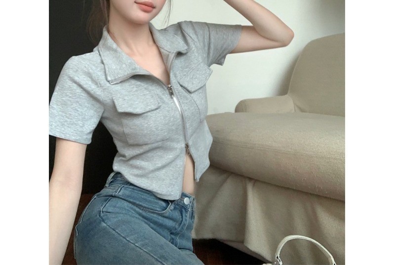 辣妹上衣T恤女ins潮夏季新款修身显瘦Polo领拉链短袖打底衫