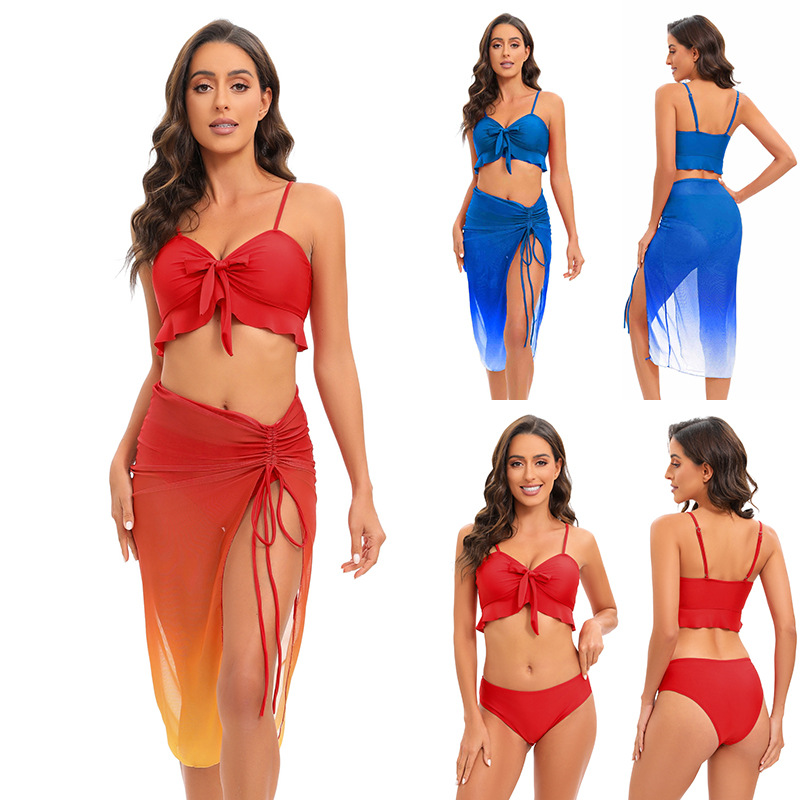 【欧美新款度假风三件套女泳衣】纯色分体三角比基尼性感bikini女