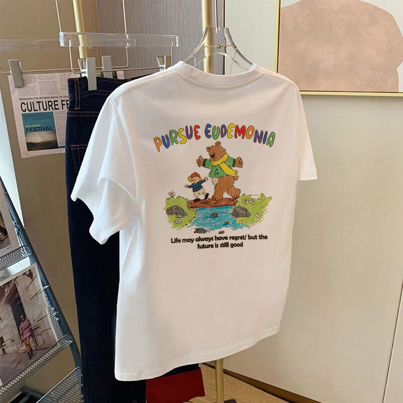 夏季新款正肩灰色小熊纯棉短袖t恤女设计感小众圆领洋气上衣
