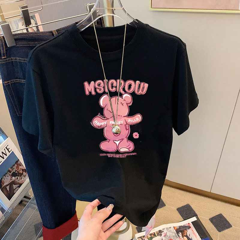 夏季2025新款白色纯棉短袖t恤女宽松百搭粉色熊印花洋气质感上衣