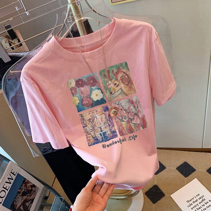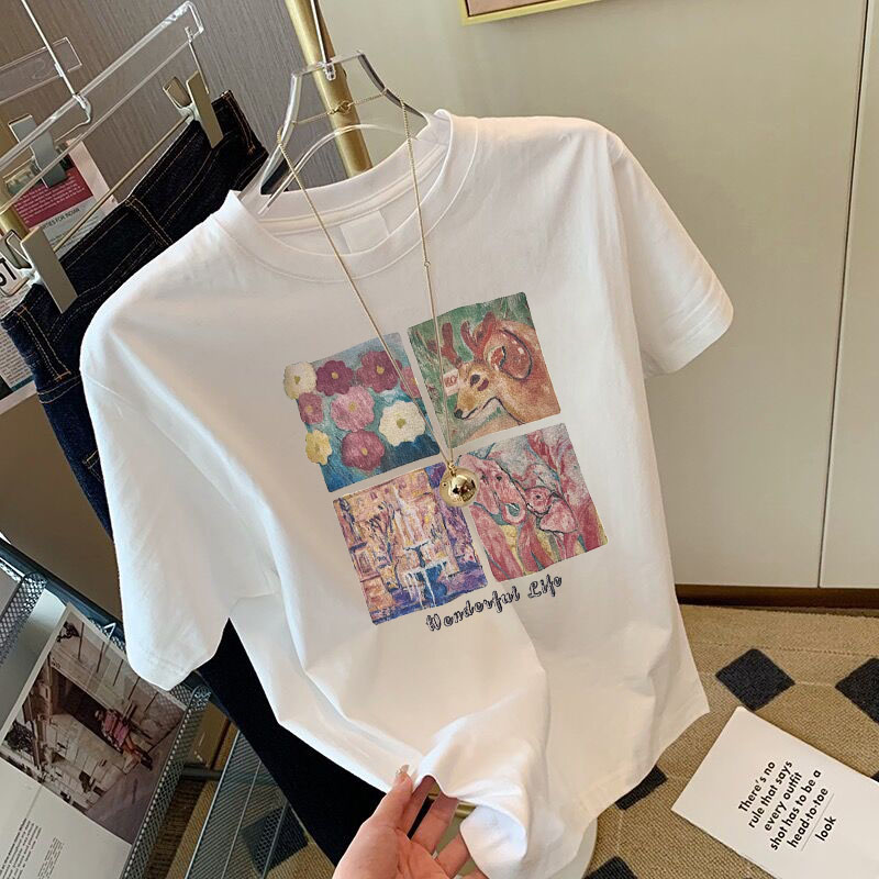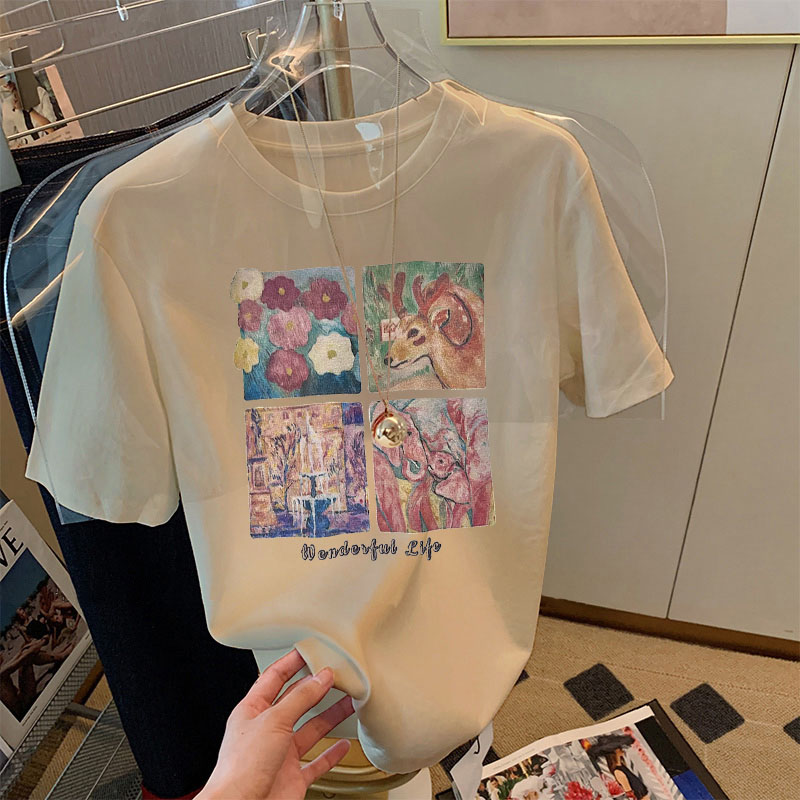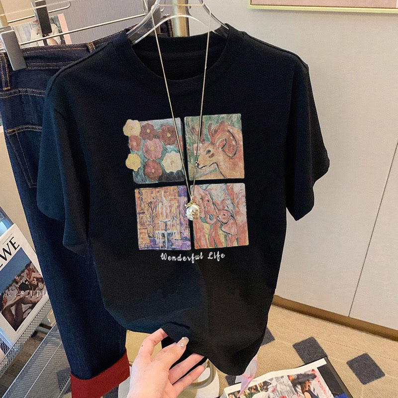 2025夏季新款正肩纯棉灰色短袖t恤女卡通印花宽松百搭质感上衣潮