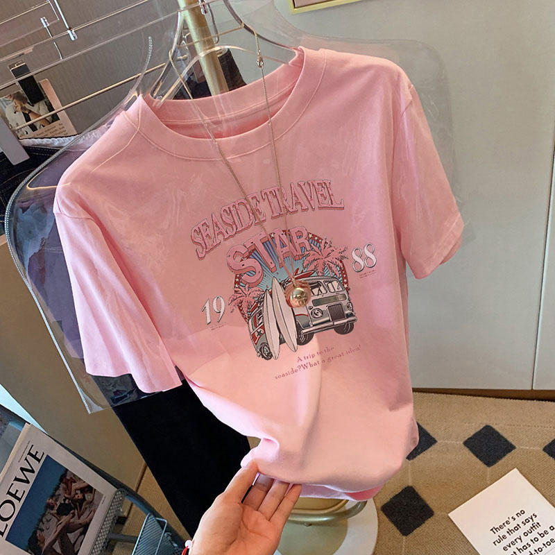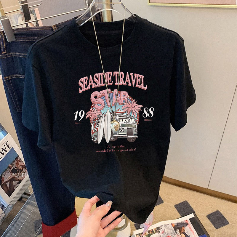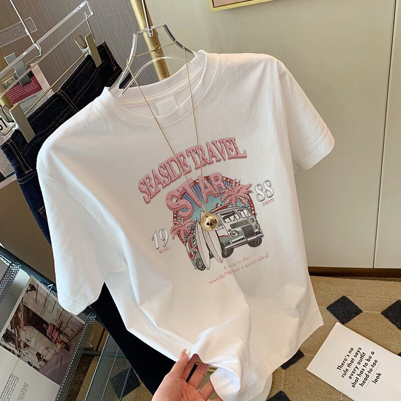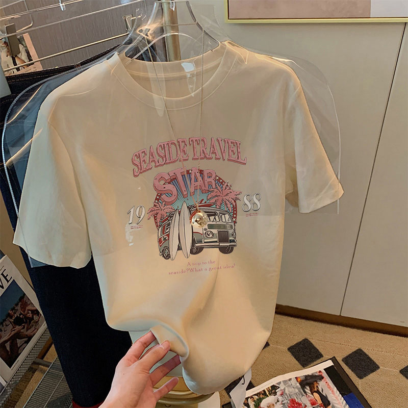 2025夏季新款正肩灰色纯棉短袖t恤女卡通印花宽松百搭质感上衣潮